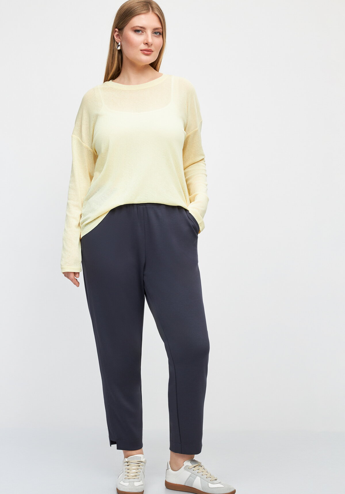 Брюки оснащены широкой закрепленной резинкой, которая не перекручивается. Модель длиной 7/8 (укороченная, подходит для роста выше 160 см) имеет карманы по бокам. По боковому шву расположены лампасы с отстрочкой — они создают разноуровневый низ брючины.