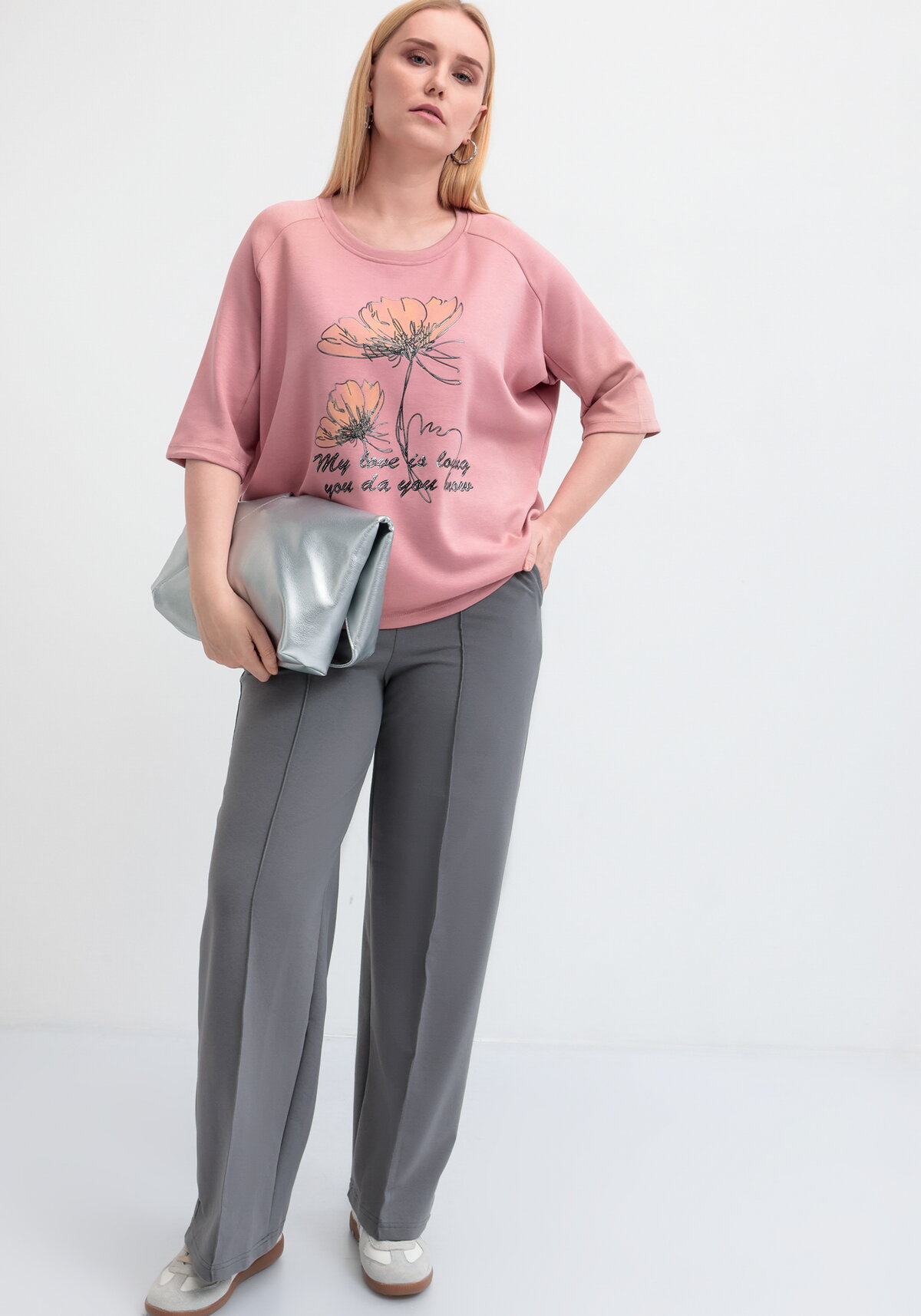Брюки прямые с карманами в боковых швах с застроченными стрелками спереди. Цельнокроенный пояс на резинке. Модель представлена в двух цветах: графитовый и черный.