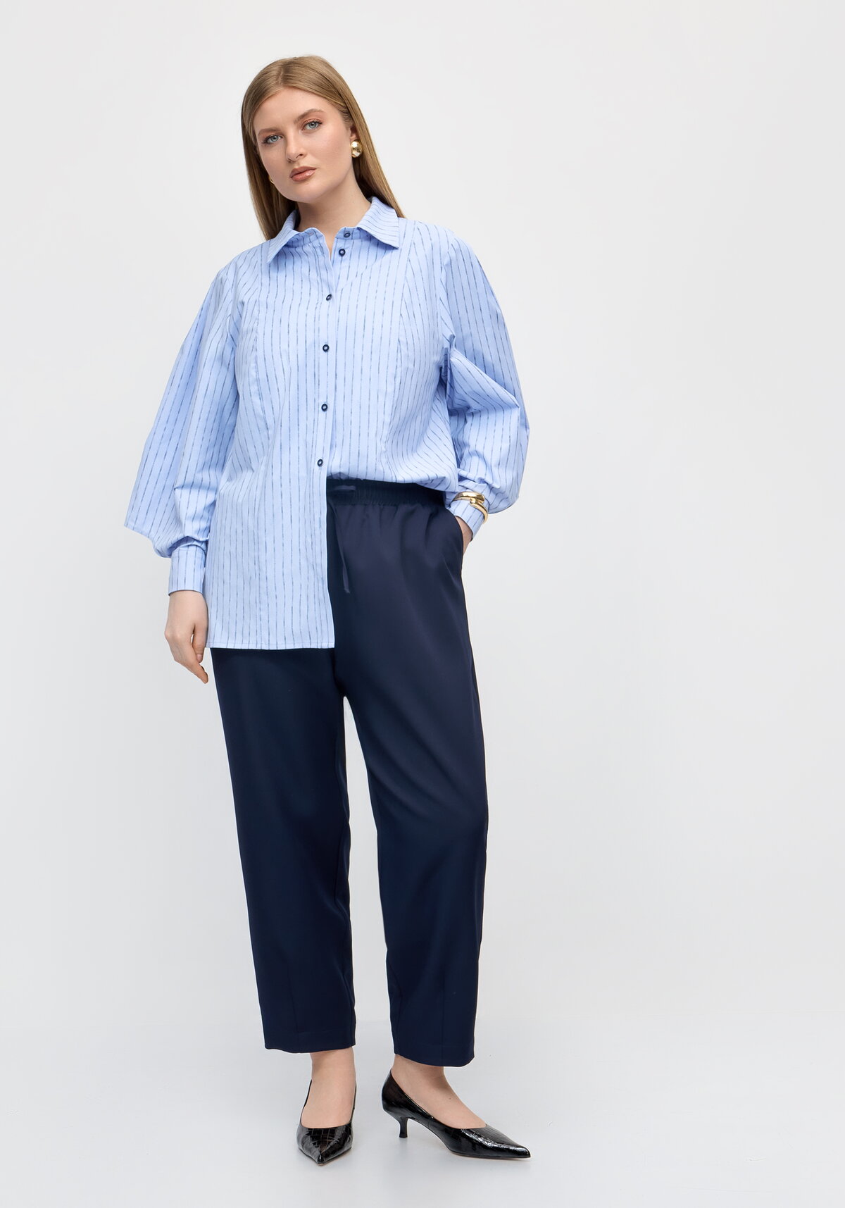 Брюки кроя "бананы" – воплощение комфорта и актуального дизайна. Благодаря свободному крою в бедрах и изящным вытачкам у самого низа, они смотрятся очень выигрышно и подходят для разных типов фигур. Пояс на мягкой резинке с регулируемой кулиской гарантирует идеальную посадку и свободу движений. А удобные косые карманы спереди – это не только стильный элемент, но и место для всего необходимого. Отличный вариант как для повседневных выходов, так и для более расслабленных офисных образов.