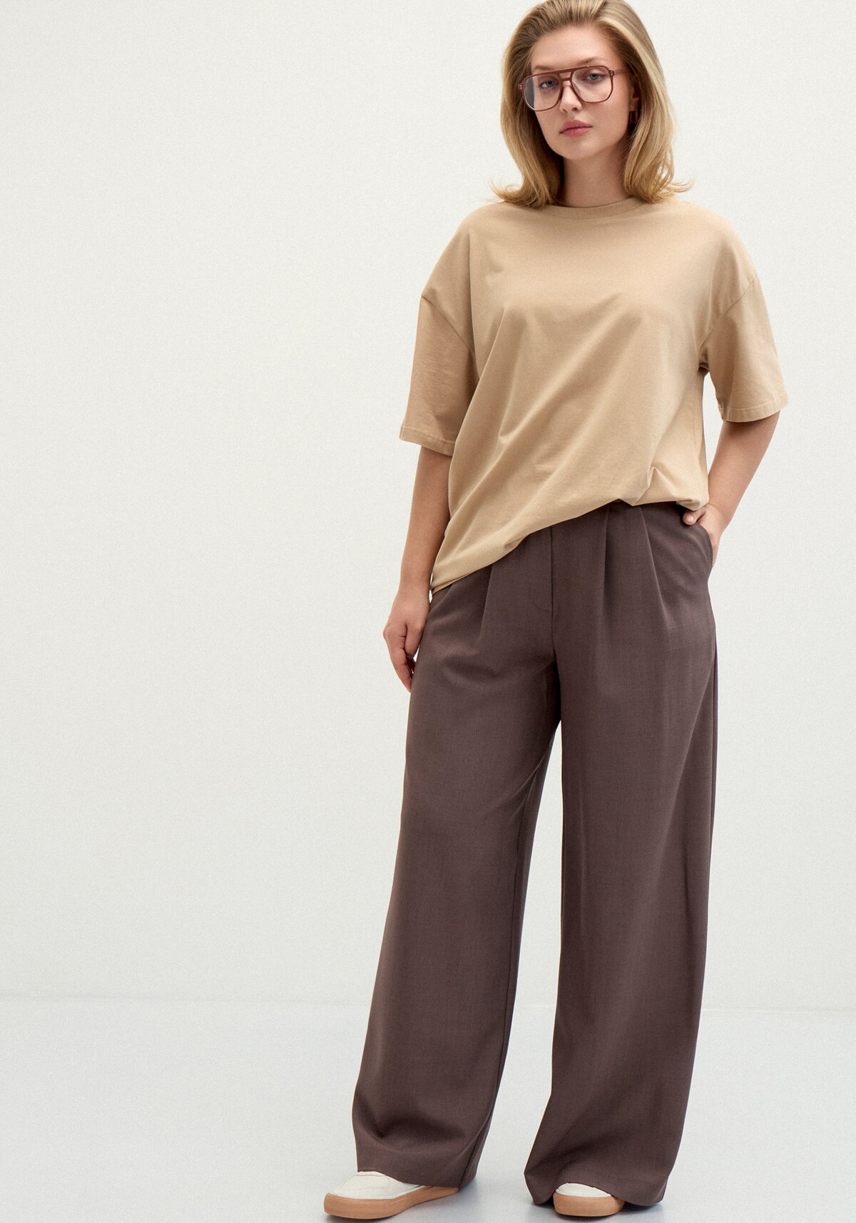 Широкие брюки-палаццо с мягкими со складками на талии. Впереди функциональные косые карманы. Застёжка на молнию и пуговицу, шлёвки для пояса. Задняя часть пояса на резинке. Модель представлена в трех цветах: коричневый, синий, зеленый.