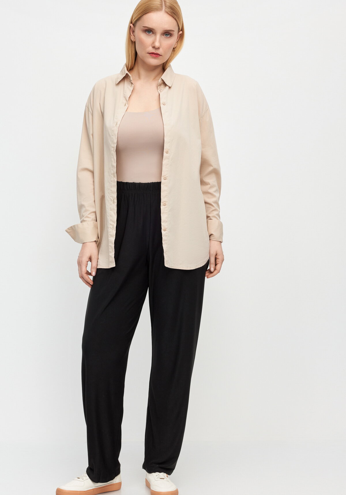 Брюки прямого силуэта подходят для повседневной носки. Модель оснащена широким поясом с резинкой. Пояс обеспечивает комфортную посадку и не ограничивает движений.