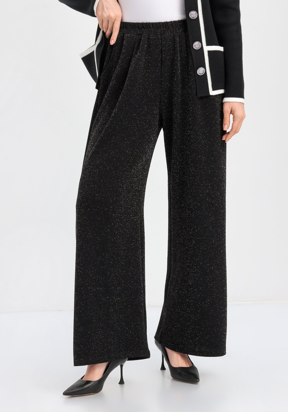 Расклешенные брюки с люрексом без фурнитуры и застежки. Брюки можно комбинировать с разными вариантами верха и обуви. По особенному поводу можно стилизовать их с лодочками.