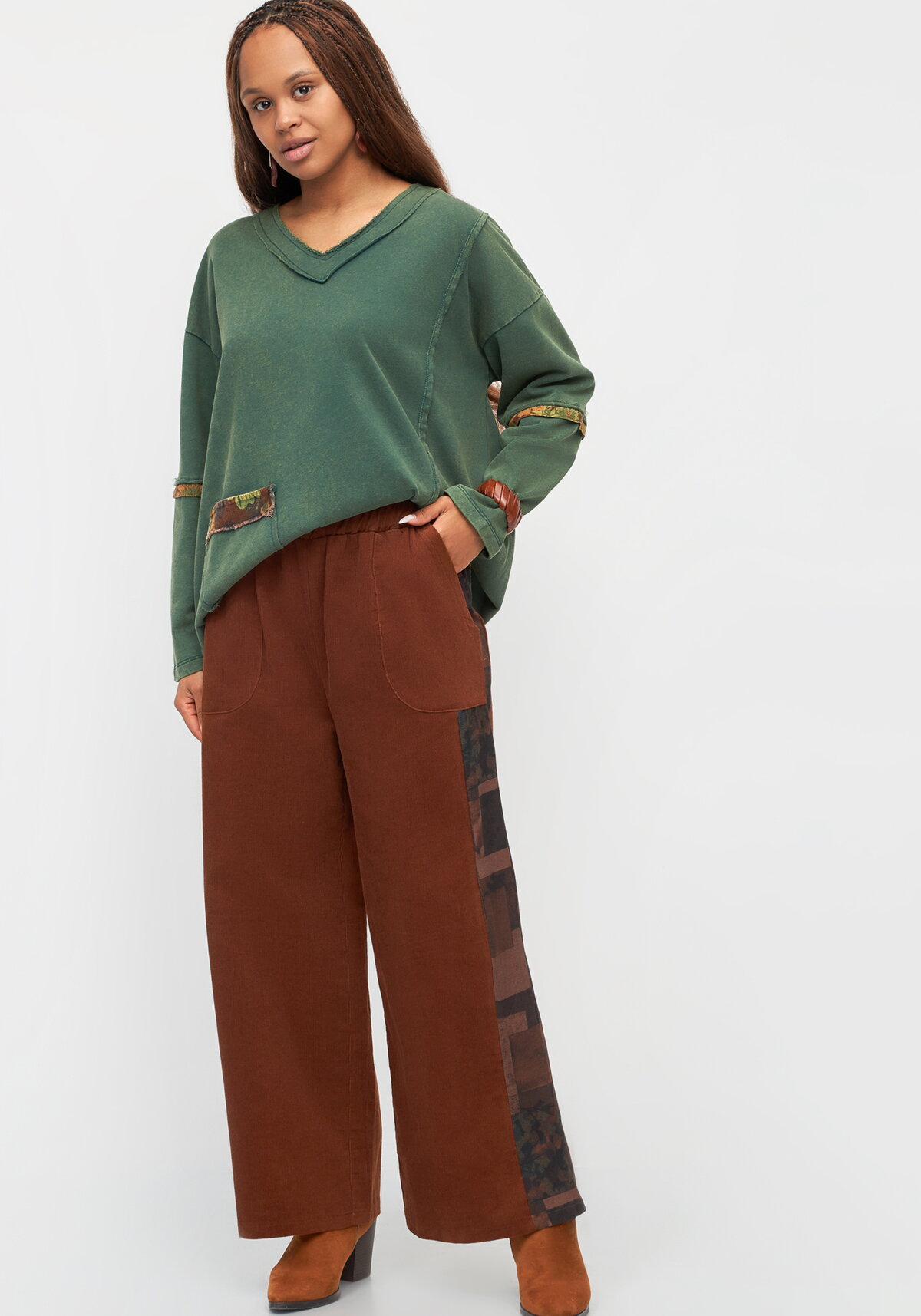 Брюки из микровельвета имеют прямой широкий крой и свободную посадку. Модель оснащена функциональными карманами спереди и поясом на резинке. По бокам расположены вставки из вельвета с принтом.