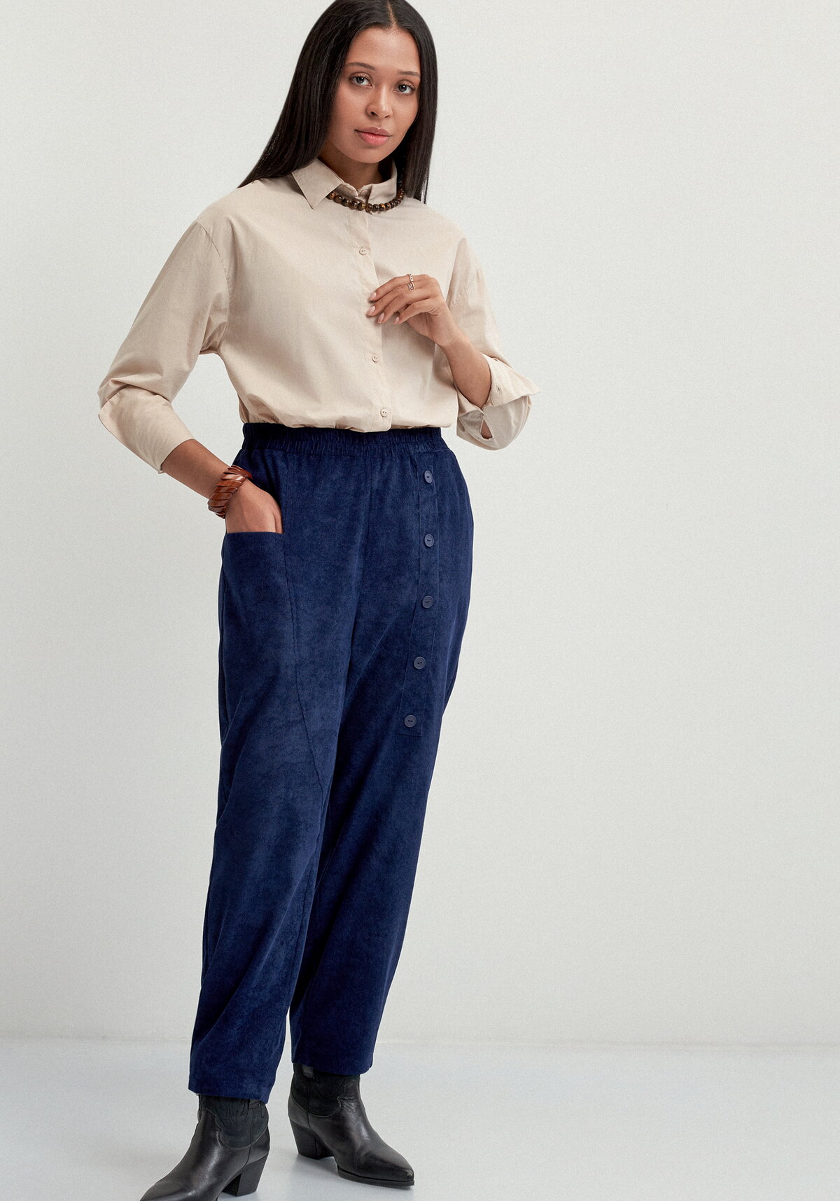 Брюки бананы длиной 7/8. Пояс притачной на резинке. На правой брючине овальный подрез до линии колена, в подрезе расположен карман. На левой брючине нашита планка с 5-ю декоративными пуговицами и карман с отрезным бочком. По спинке кокетка с 2-мя фальш-листочками.