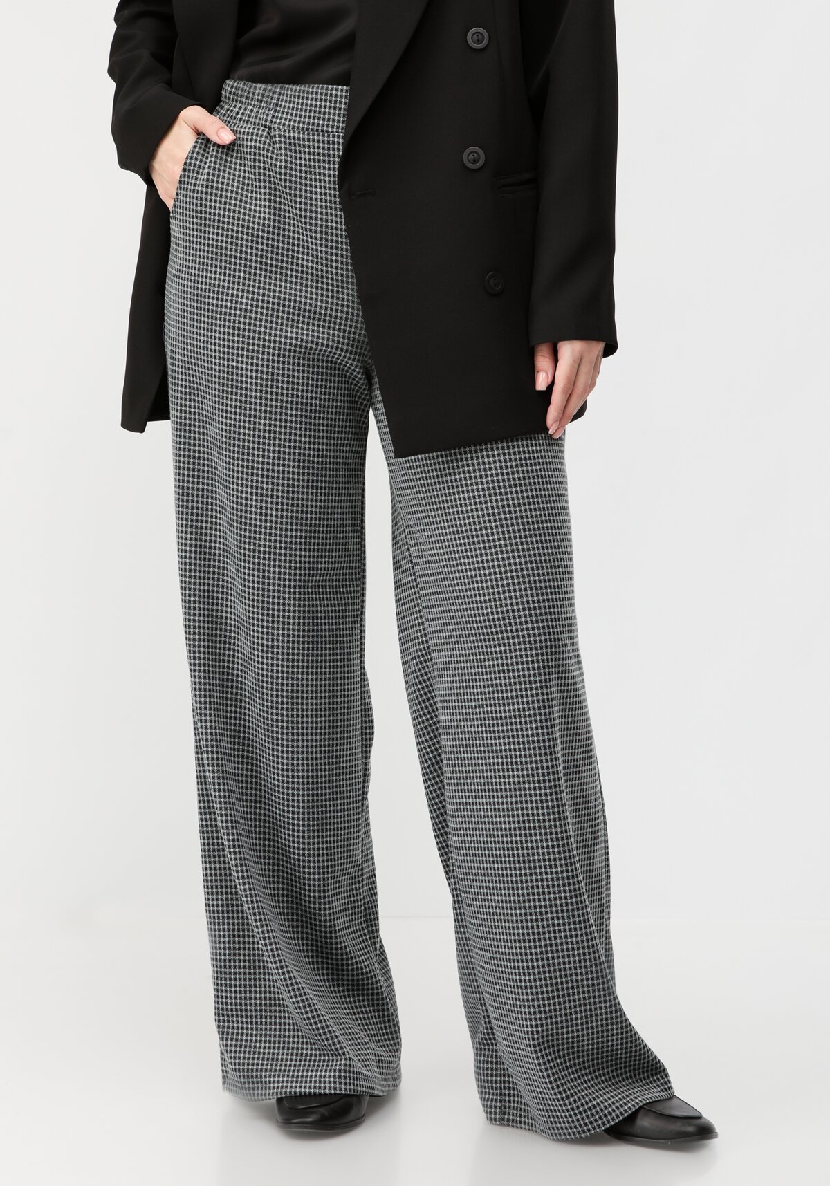 Брюки прямого кроя в мелкую клетку на резинке в поясе с высокой посадкой. Отсутствие фурнитуры, молнии и других деталей придает брюкам лаконичность. Практичный и функциональный выбор в офис и на деловую встречу.