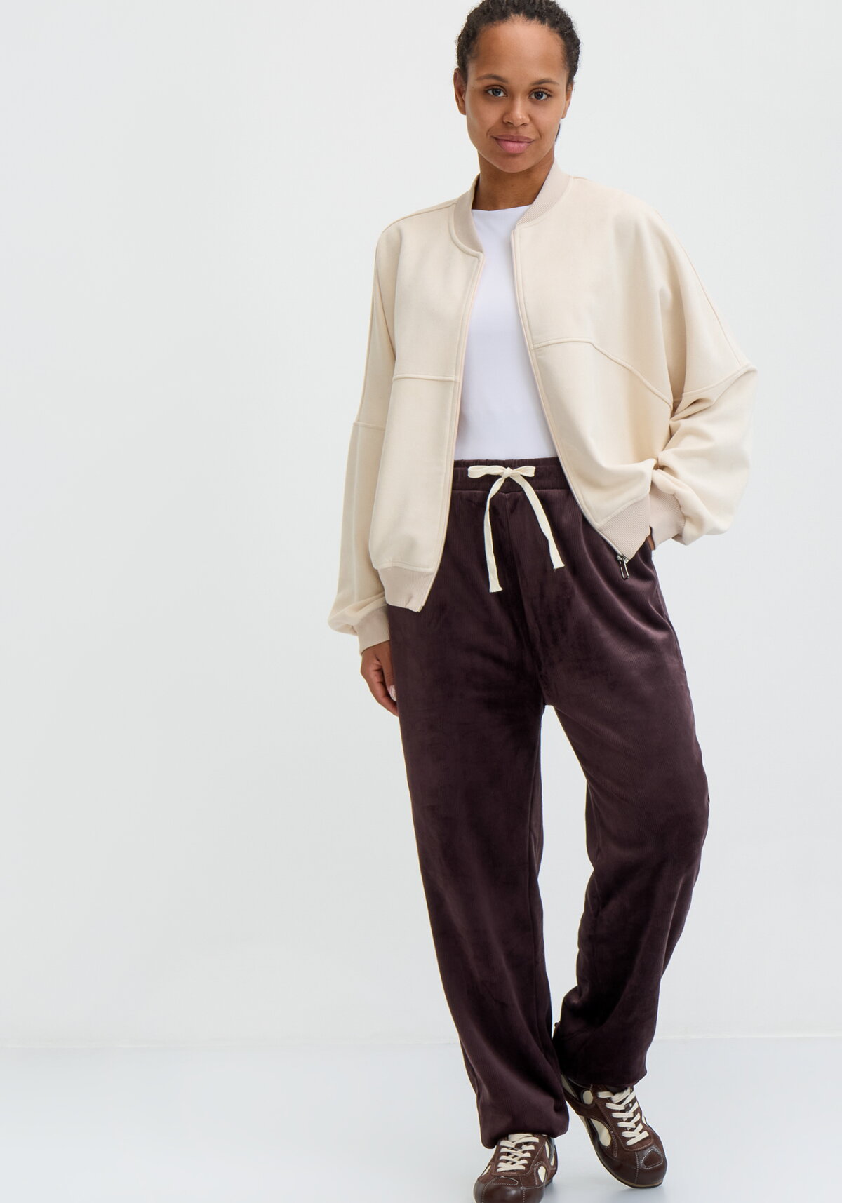Утепленные вельветовые брюки прямого кроя. Модель с высокой посадкой и поясом на резинке и шнурке для идеальной посадки. Прямой крой обеспечивает максимальный комфорт, а утепляющая подкладка из искусственного меха эффективно согревает при температуре до -15 °C. Дополнительные детали — низ на резинке и функциональный карман с отрезным бочком.
