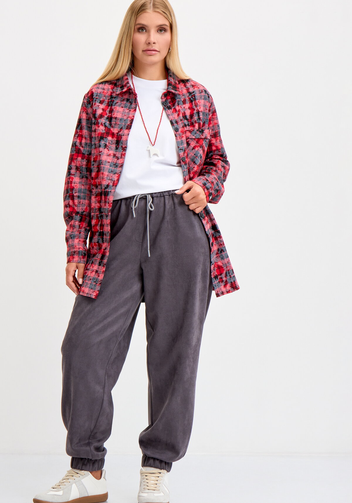 Брюки свободного силуэта на резинке и отделочном шнурке, низ изделия на резинке. Карманы-хулиганы, имитация гульфика.