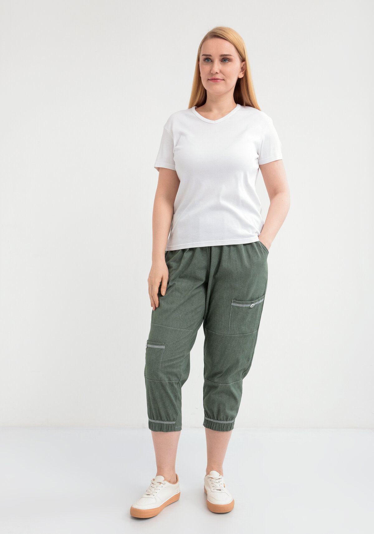 Удобные брюки из натурального хлопка с высокой посадкой и асимметричными карманами. Манжеты по низу брючин. Оригинальный контрастный шов. Можно составить стильный комплект с туникой «Кэтрин».