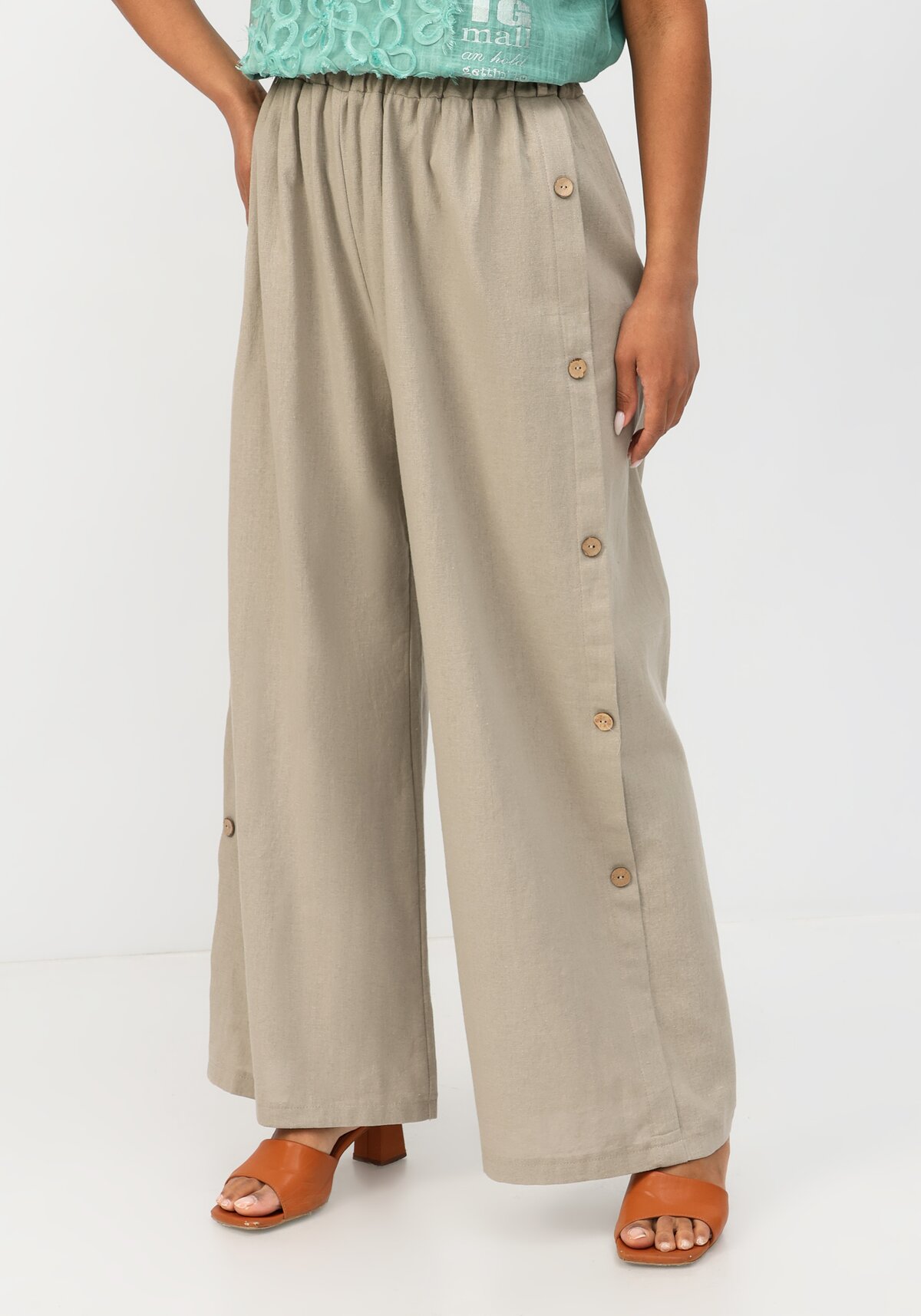 Брюки свободного силуэта, без карманов. По бокам декорированы пуговицами.