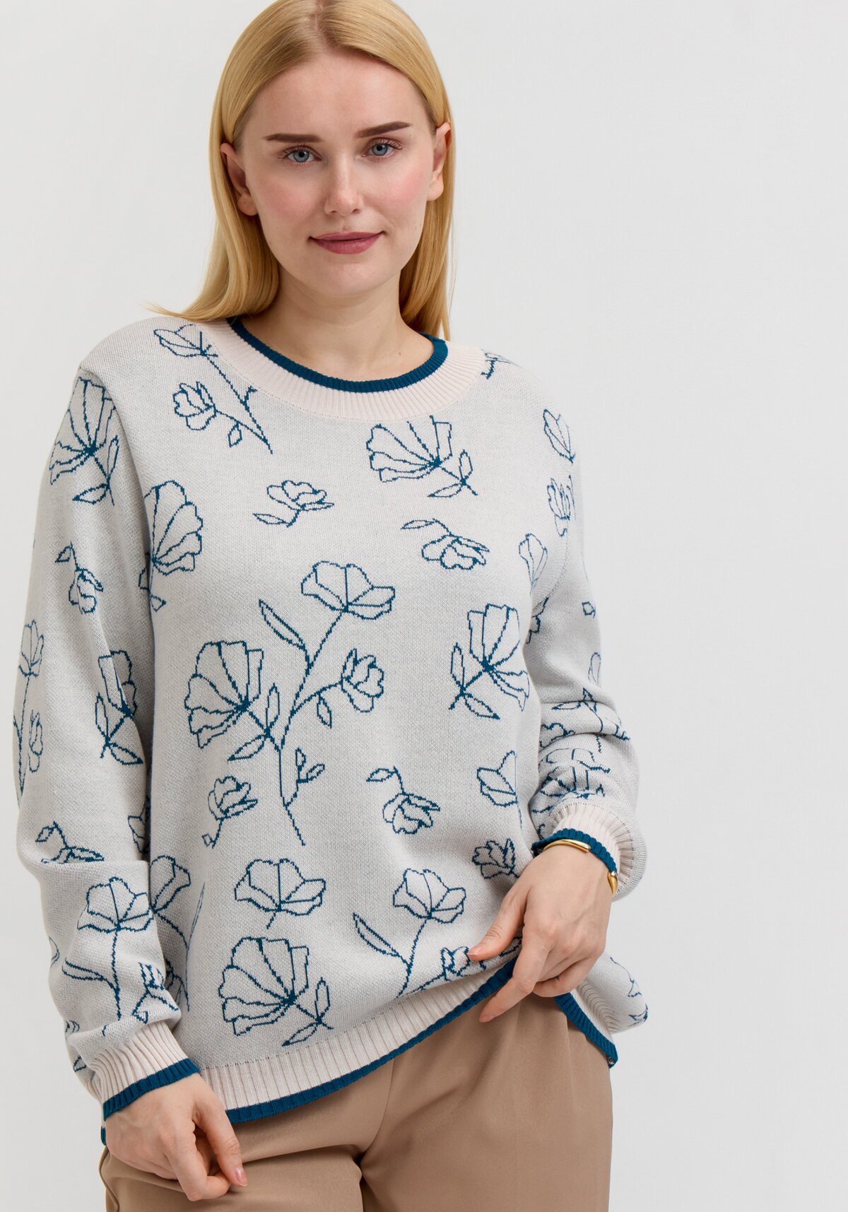 Вязаный джемпер полуприлегающего силуэта с втачными рукавами. Модель представлена в двух цветах: синий и серый.