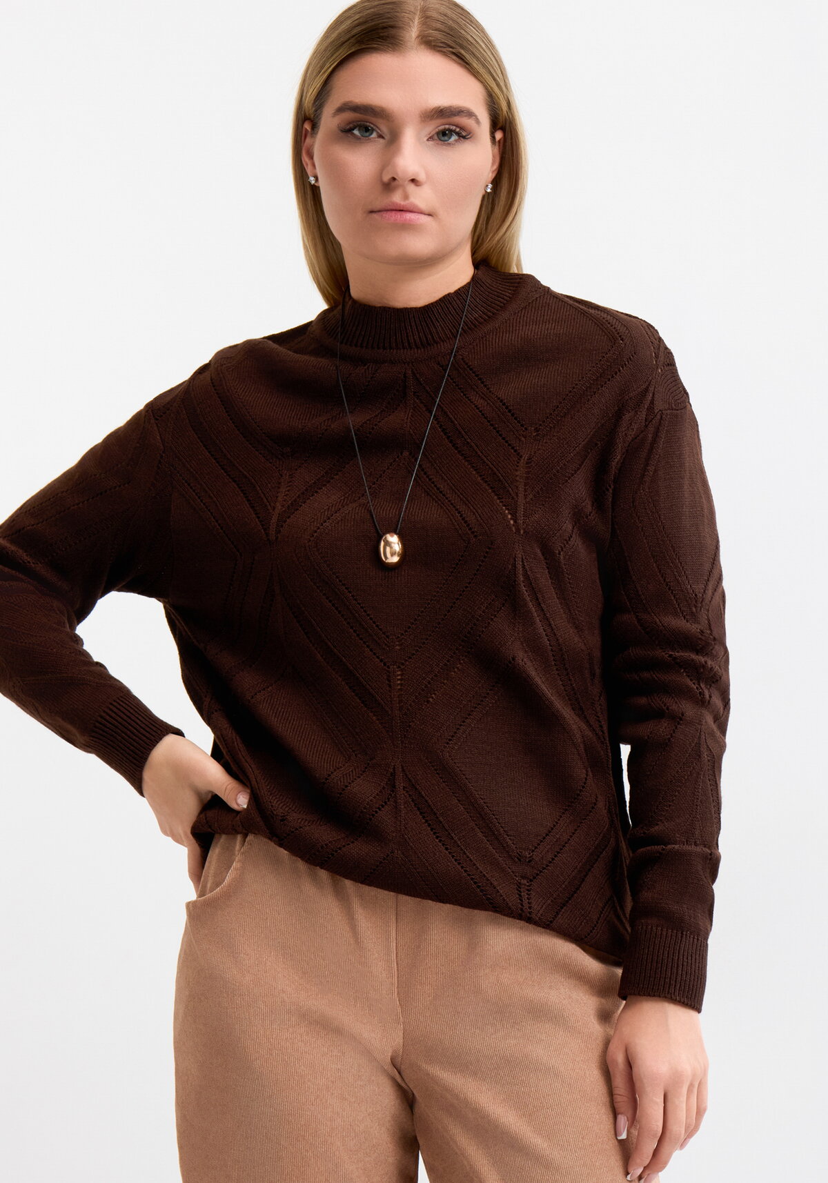 Вязаный ажурный джемпер. Втачной длинный рукав. Эластичная резинка на манжетах, воротнике и по низу.