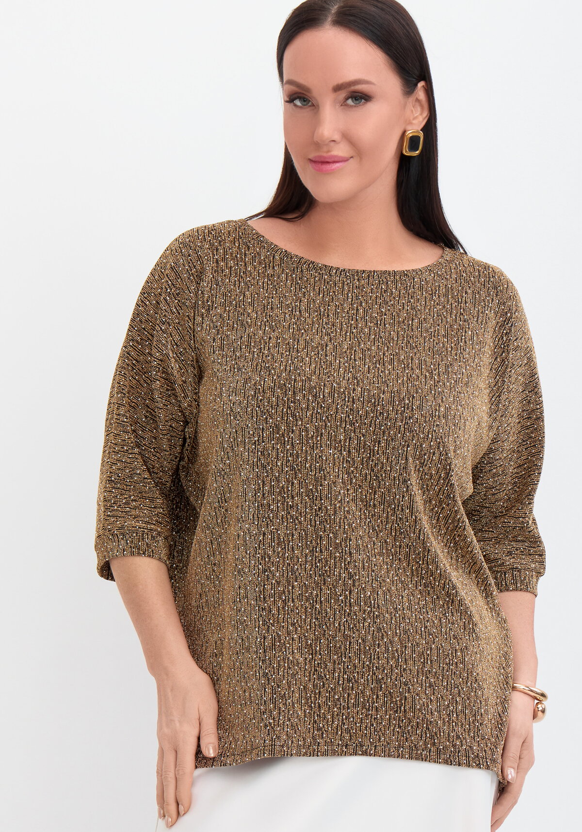Джемпер свободного кроя с элегантным округлым вырезом горловины. Модель дополнена рукавами "летучая мышь" длиной 3/4, что создает непринужденный и стильный силуэт.