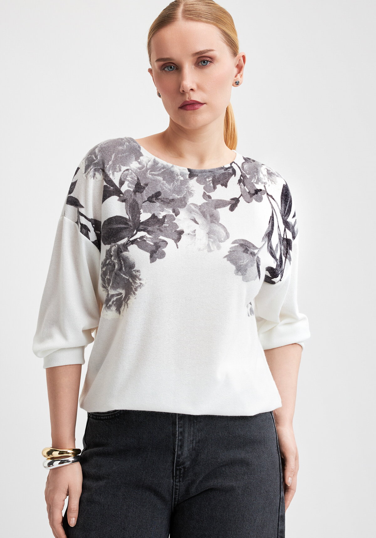 Романтический джемпер с цветами. Полуприлегающий силуэт и укороченный рукав. Горловина-лодочка. Пройма рукава немного заниженная.