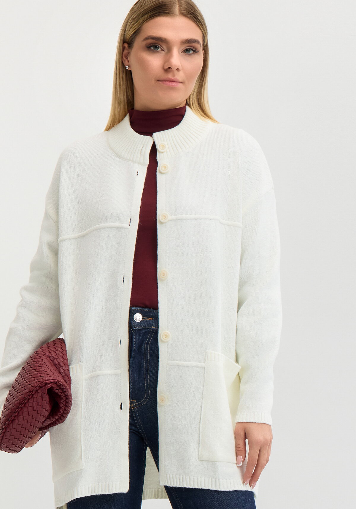 Джемпер полуприлегающего силуэта на пуговицах с длинными втачными рукавами. Воротник-стойка. Два накладных кармана. Застежка на 6 пуговиц.
