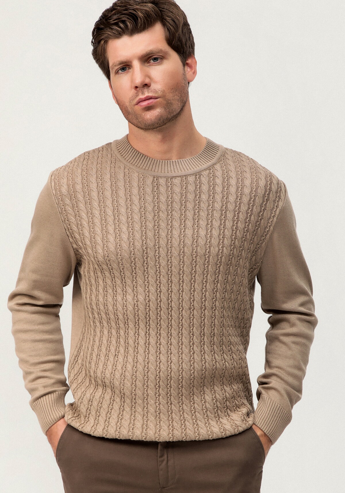 Джемпер прямого кроя с вязкой в виде кос спереди. Манжеты и низ изделия завершены резинкой, которая позволяет фиксировать их выше или ниже в зависимости от вашего комфорта и предпочтений. Спереди джемпер вывязан эффектными косами, расположенными вертикально, которые оптически вытягивают силуэт. Джемпер выполнен из стабилизированной пряжи, благодаря чему он не линяет, не выгорает на солнце и прекрасно держит форму даже после многократных стирок. За ним легко ухаживать: рекомендована машинная стирку при температуре не выше 30 градусов, легко сушится и гладится обычным способом. Джемпер станет базовой вещью мужского гардероба, и его можно будет органично вписать в самые разные образы.