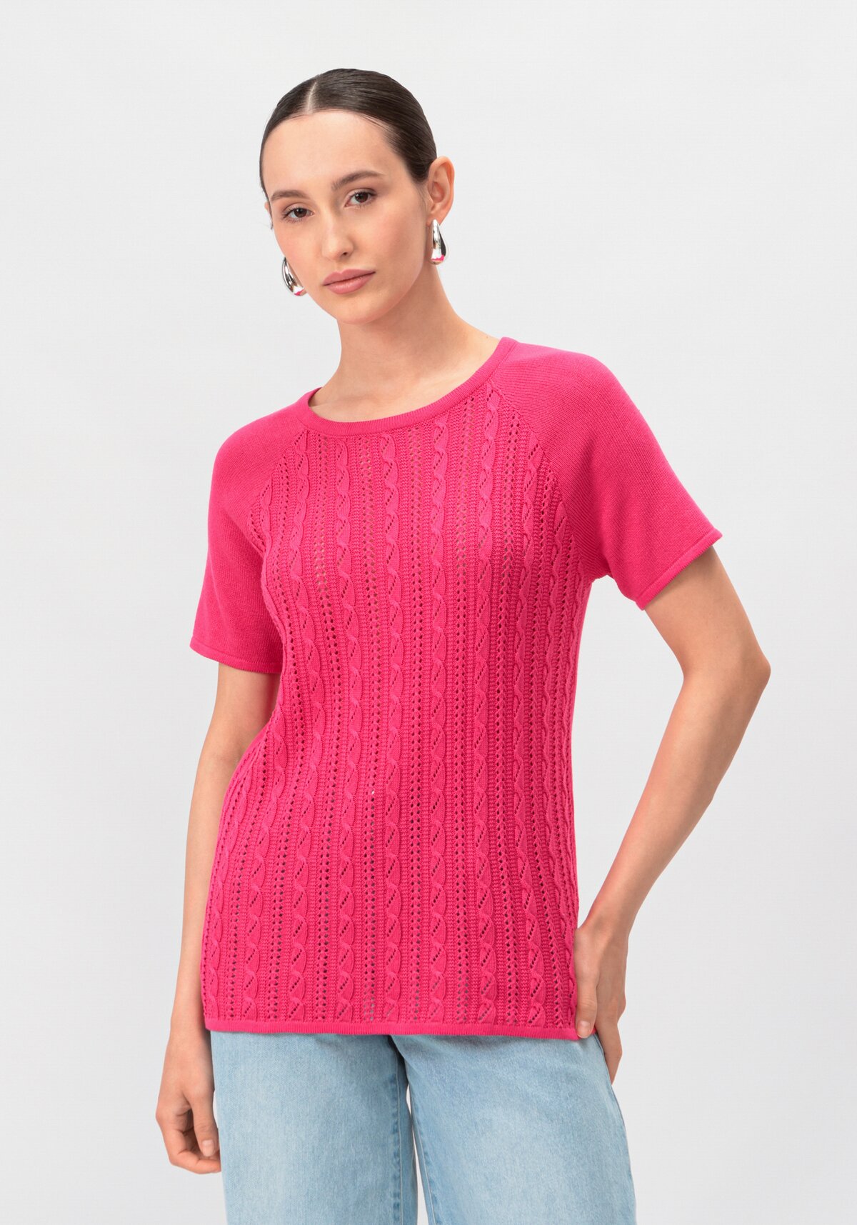 Комфортный ажурный джемпер с коротким рукавом. Практичная летняя модель, с которой можно создать множество женственных и романтических образов. В составе натуральный хлопок. Актуальные расцветки. Широкий размерный ряд.