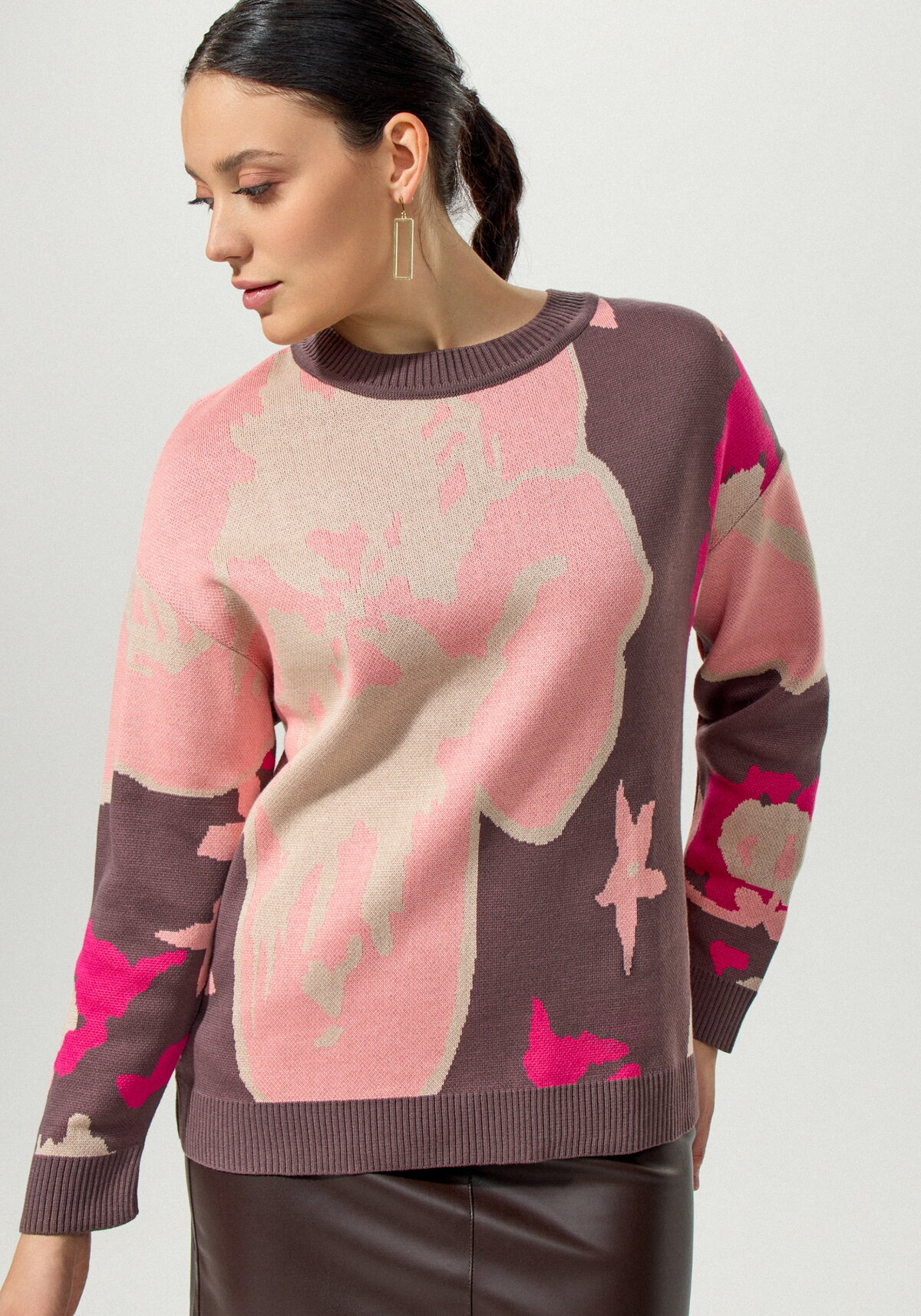 Эффектный джемпер свободного кроя с крупным рисунком. Спущенное плечо корректирует зону предплечья и обеспечивает дополнительную свободу в области деликатной зоны рук. Манжеты и низ джемпера обрамлены эластичной резинкой, которая позволяет фиксировать их выше или ниже, по желанию. Джемпер украшен эффектным абстрактным рисунком, вывязанным жаккардом, который придает силуэту стройности и делает изделие износостойким и долговечным.