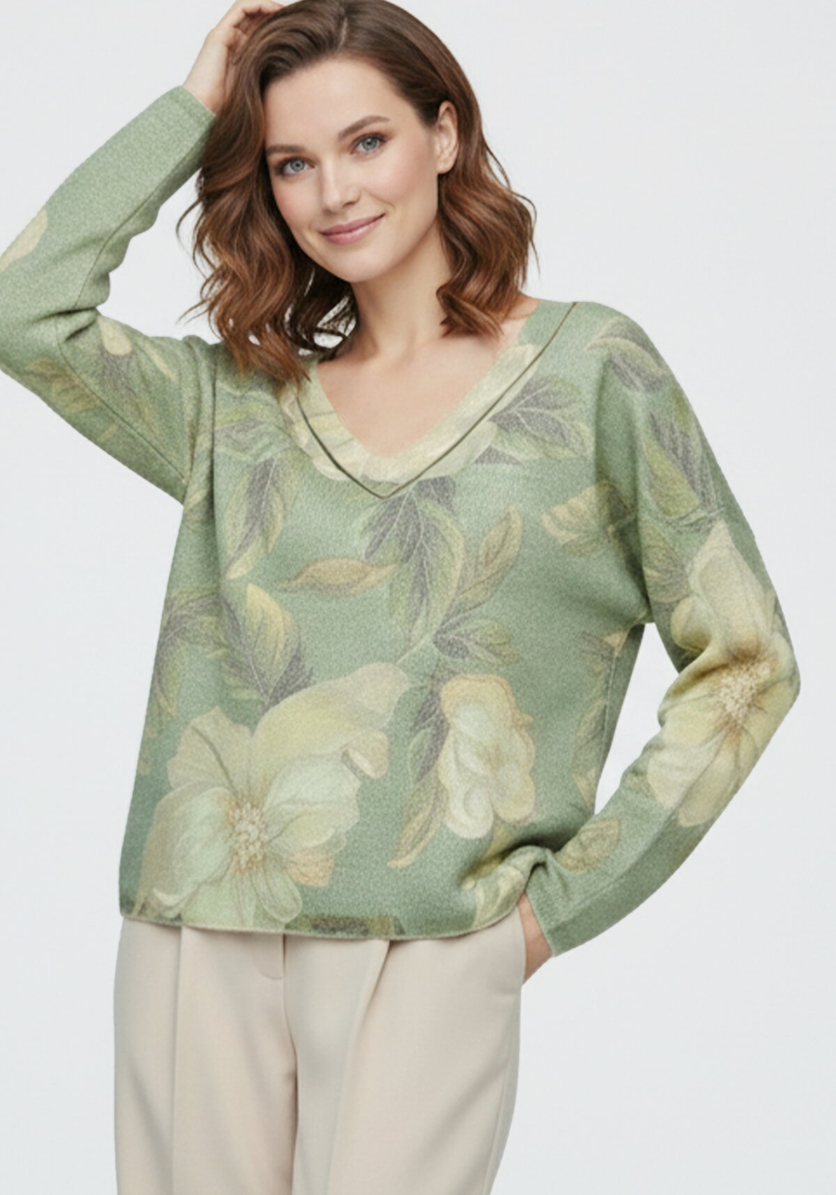 Трикотажный джемпер имеет свободный покрой и длинный рукав. Горловина выполнена в V‑образной форме. Модель отличается комфортным силуэтом и универсальностью.