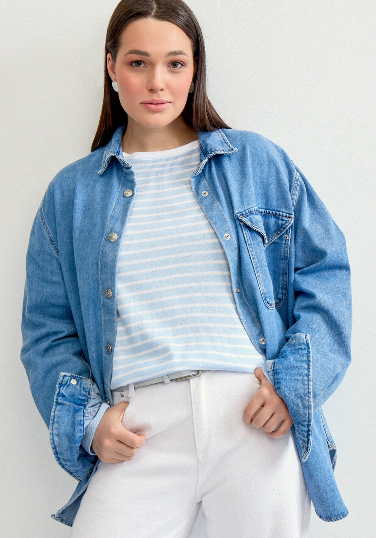 Джемпер в горизонтальную полоску с круглым вырезом горловины. Свободный крой дарит особый комфорт и скрывает недостатки фигуры. Модный джемпер не сковывает движения.