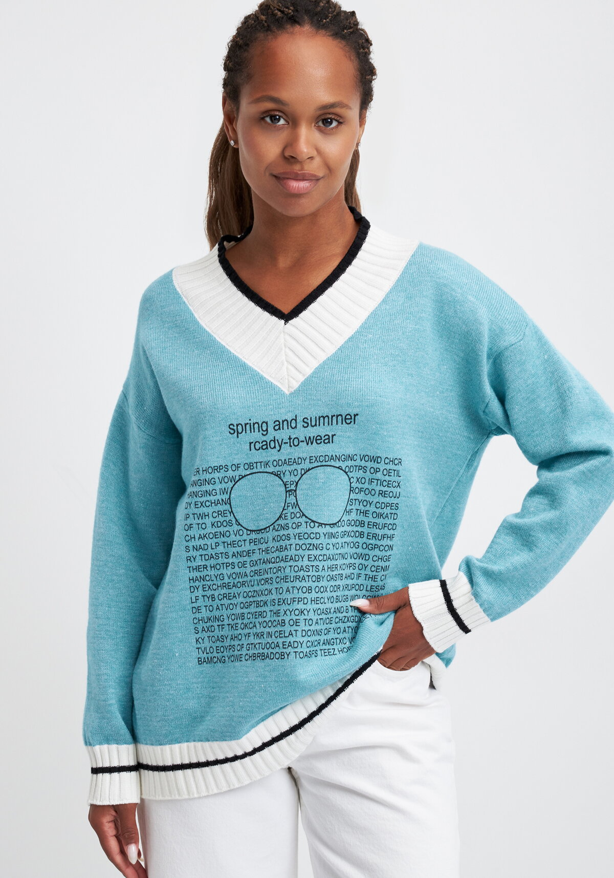 Стильный джемпер с принтом. Имеет длинный рукав и V-образный вырез. Модель представлена в пяти цветах: бежевый, хаки, черный, серый, зеленый.