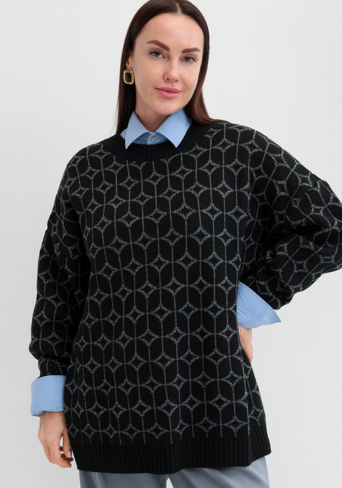 Джемпер вязаный свободного кроя ниже бедра. Длинный рукав. Высокое горло. По низу рукавов и изделия вязка резинкой.