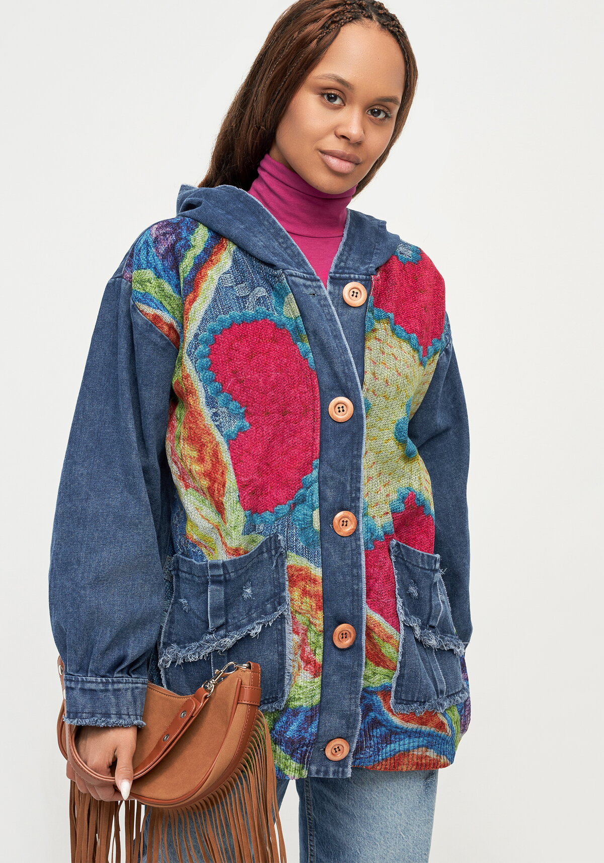 Жакет выполнен в свободном крое и дополнен капюшоном. Модель комбинирована из вязаного полотна с принтом и джинсовой ткани, имеет однобортную застежку на пуговицы. Изделие оснащено спущенным плечом, свободными рукавами с манжетами и накладными карманами.