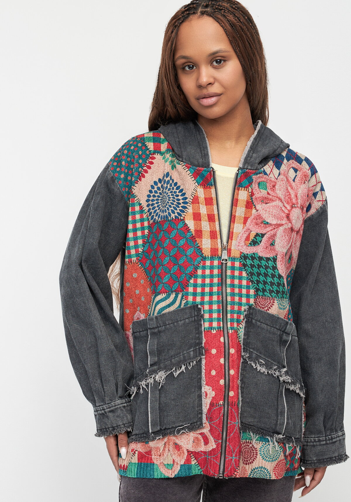 Жакет выполнен в свободном крое и дополнен капюшоном. Модель сочетает вязаное полотно с принтом и джинсовую ткань, застегивается на молнию. У жакета спущенная линия плеча, свободные рукава с манжетами по низу и накладные карманы.