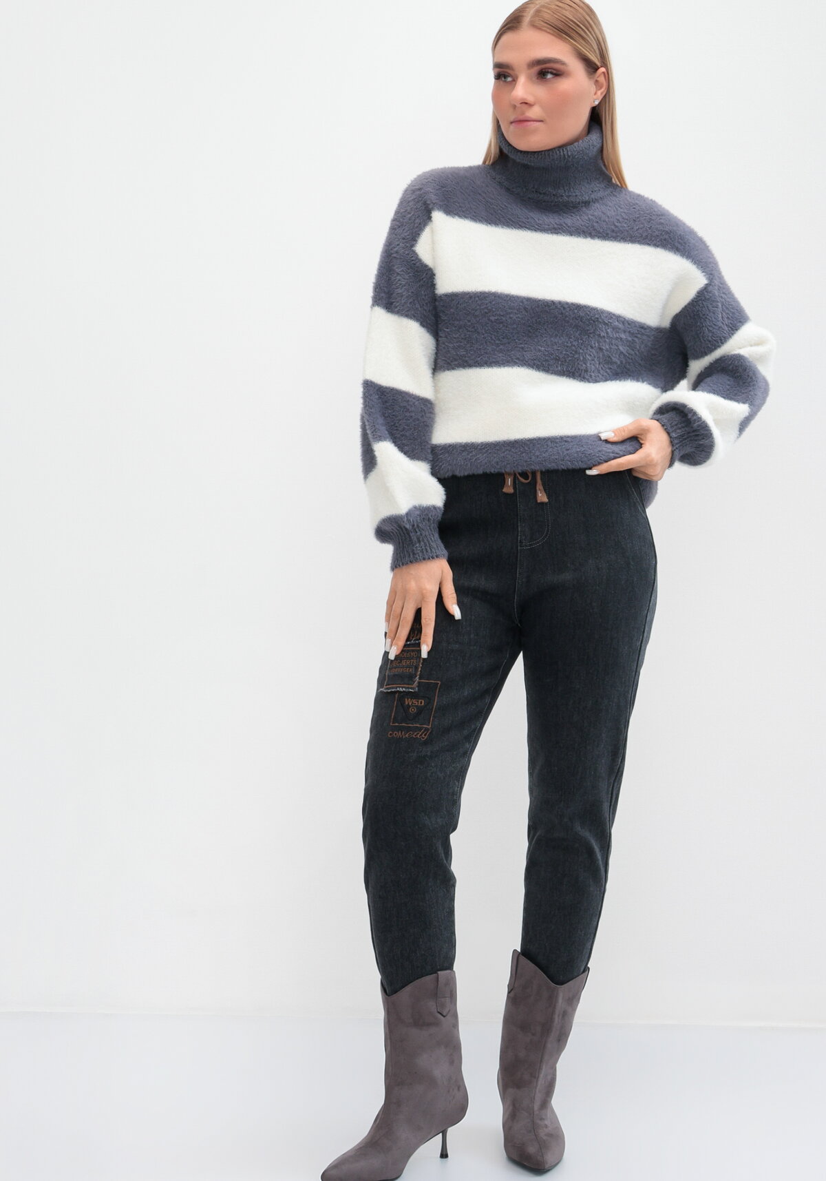 Утепленные джинсы с начесом. Пояс на резинке со шнурком обеспечивает комфортную посадку. Модель с карманами декорирована вышивкой.