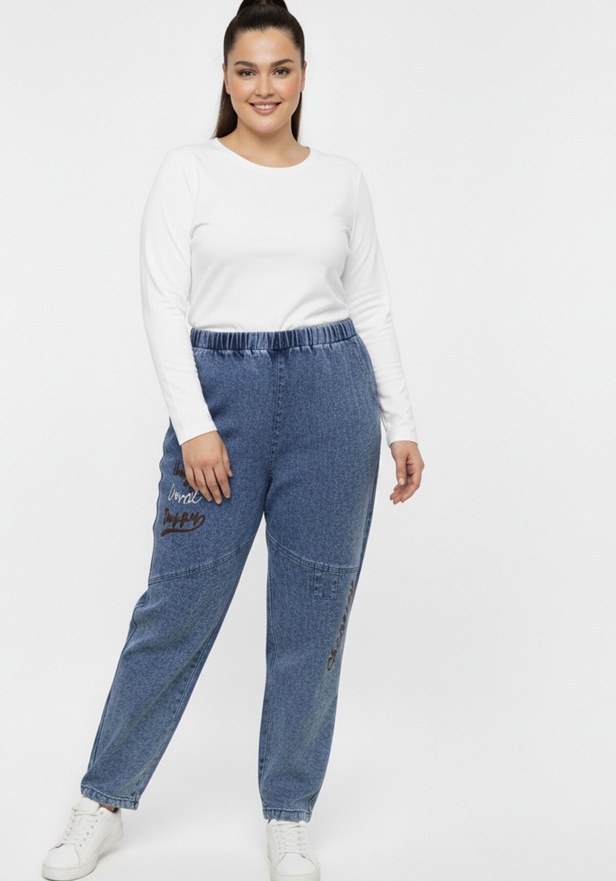 Джинсы с вышивкой — удачный микс комфорта и яркого стиля. Пояс на резинке обеспечивает идеальную посадку и свободу движений, а функциональные карманы добавляют практичности.