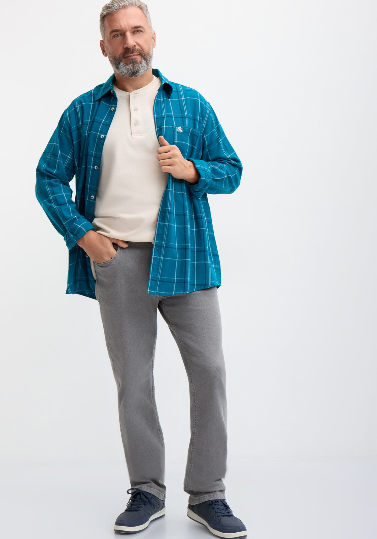 Прочные джинсы из эластичного денима. Прямой крой делает изделие подходящим для любой фигуры. Джинсы снабжены 2 косыми карманами с заклепками, 1 передним кармашком и 2 задними накладными карманами. Плоский пояс со шлевками застегивается на молнию и круглую пуговицу. Модель прошита контрастной охровой строчкой.