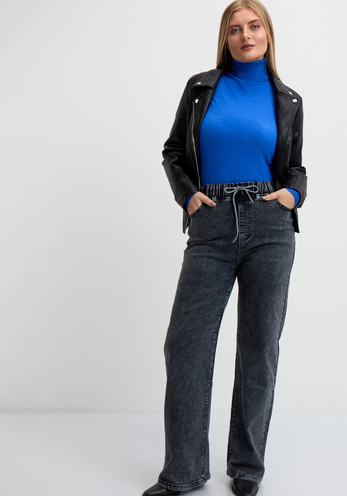 Джинсы с широкими штанинами. Пояс на резинке с кулиской. Карманы спереди и сзади. Модель представлена в двух цветах: серый и синий.