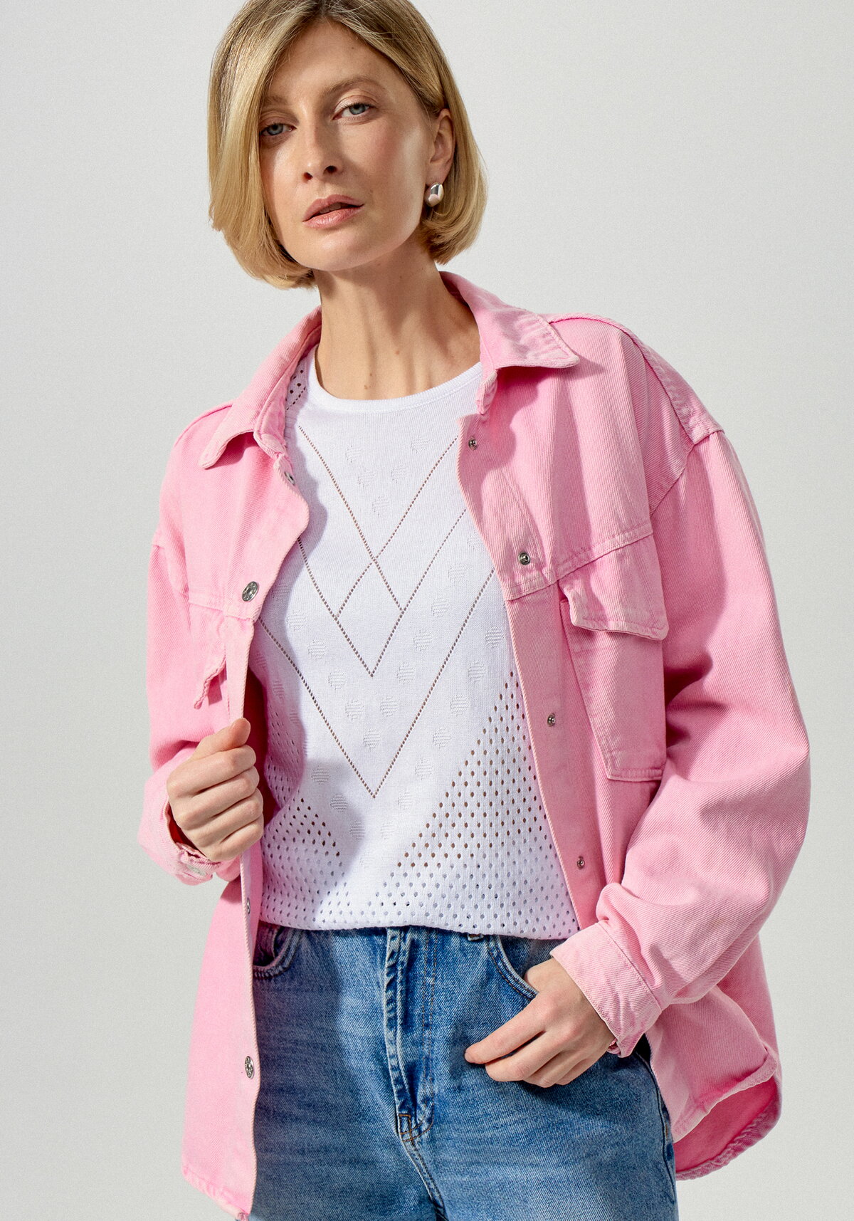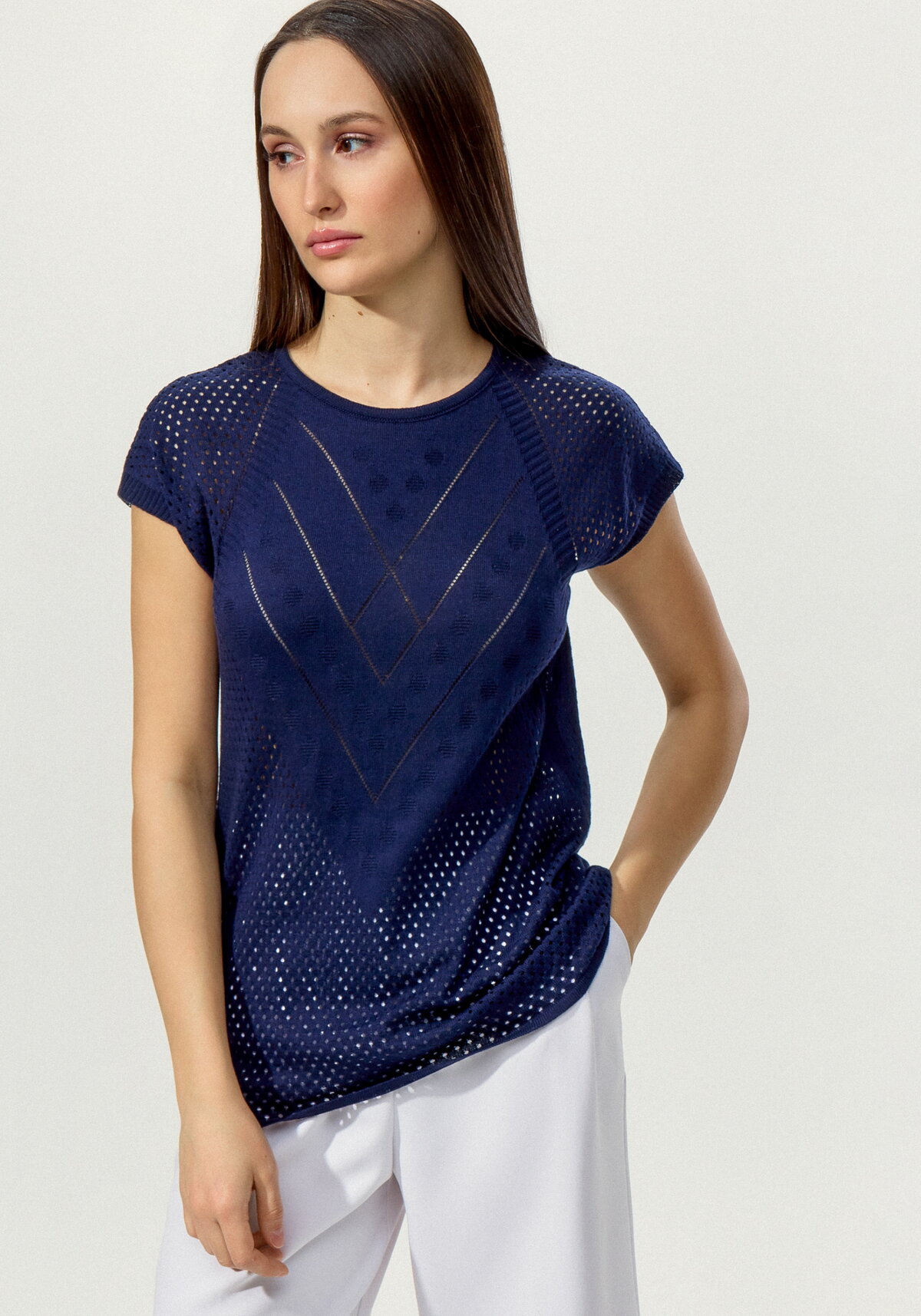 Футболка из хлопка с пан-волокном. Спереди в зоне бюста футболка декорирована конусообразным рисунком, который придает силуэту стройности. Полотно футболки выполнено эффектным ажуром, который создает женственный образ и обеспечивает воздухопроницаемость.