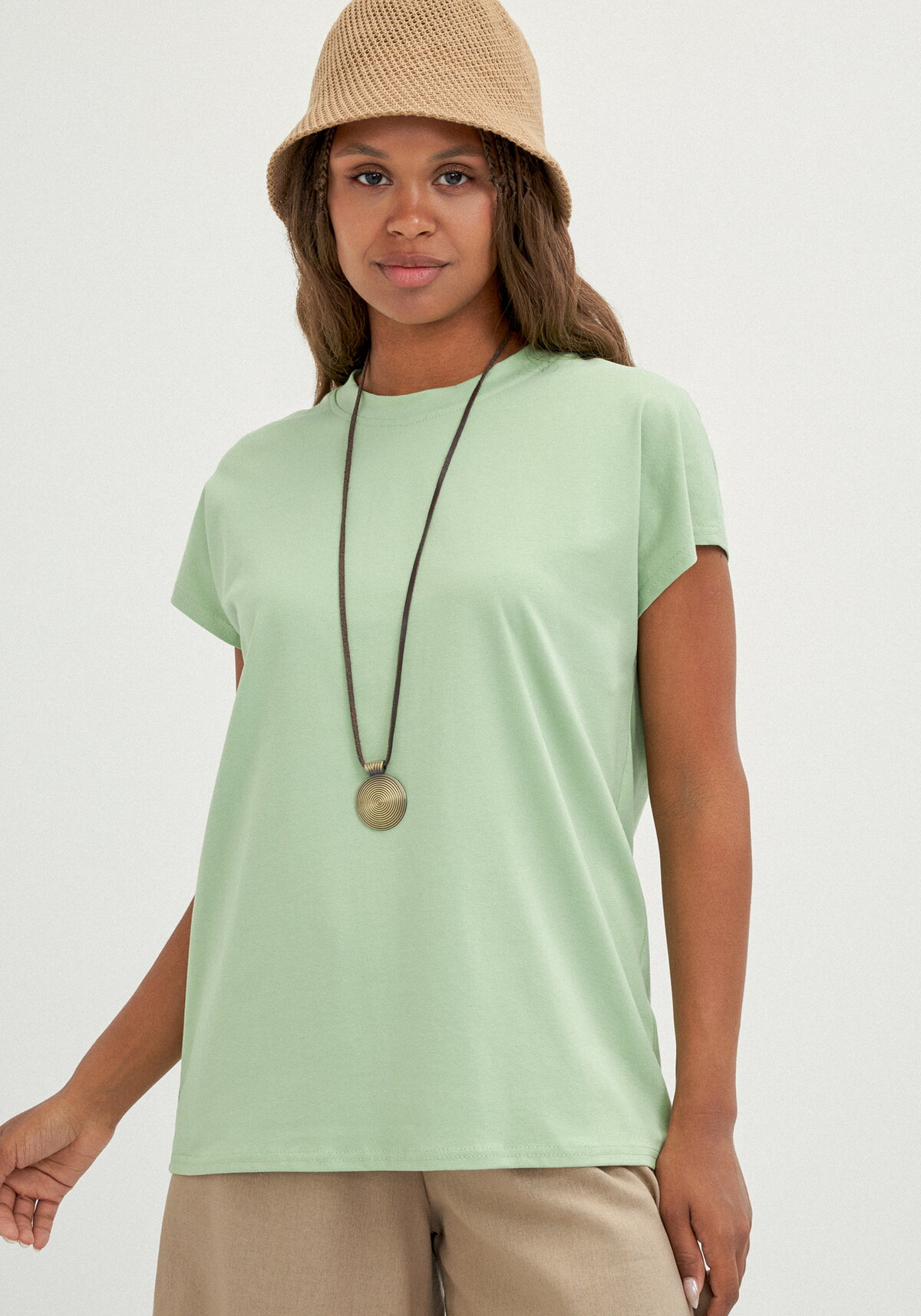 Футболка полуприлегающего силуэта со спущенным плечом. Вырез горловины круглый. Модель представлена в пяти цветах: сиреневый, молочный, голубой, горчичный, фисташковый.