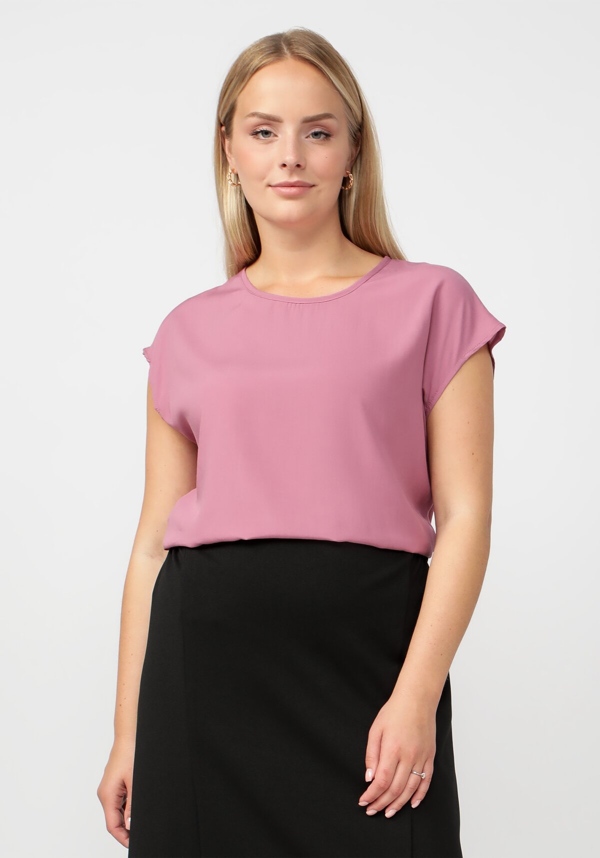 Блуза свободного кроя с вискозой и хлопком в составе. Комбинируется с брюками и юбками разных фасонов. Круглая горловина и короткий рукав. Модель представлена в трех цветах: голубой, оливковый, темно-розовый.