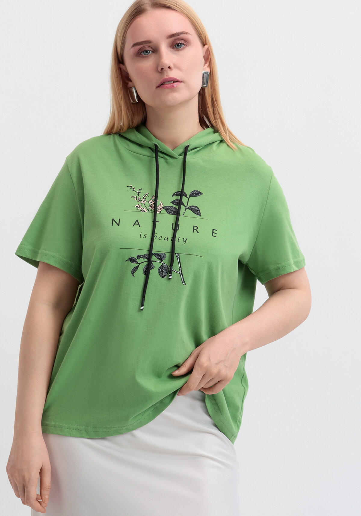 Хлопковая футболка полуприлегающего силуэта с капюшоном на кулиске. Рукав короткий втачной. Впереди стильный лаконичный принт. Модель представлена в пяти цветах: молочный, розовый, голубой, серый, оливковый.