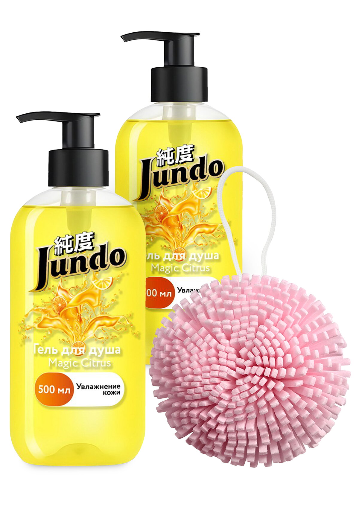 - Набор из двух бутылок геля для душа с цитрусовым ароматом и подарочной мочалки-спонжа