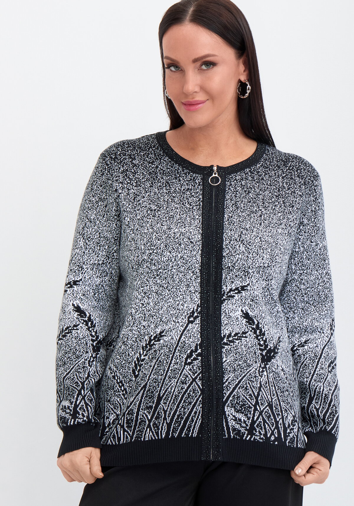 Кардиган прямого кроя с застежкой-молнией украшен узорами. Манжеты и низ изделия оформлены эластичной резинкой.