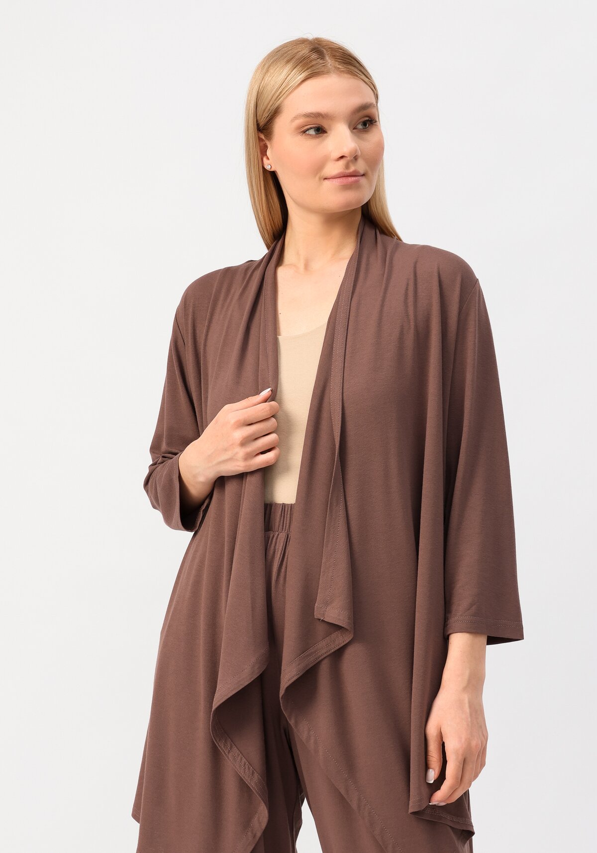 Кардиган свободного кроя без застежки и карманов. Длина до середины бедра.