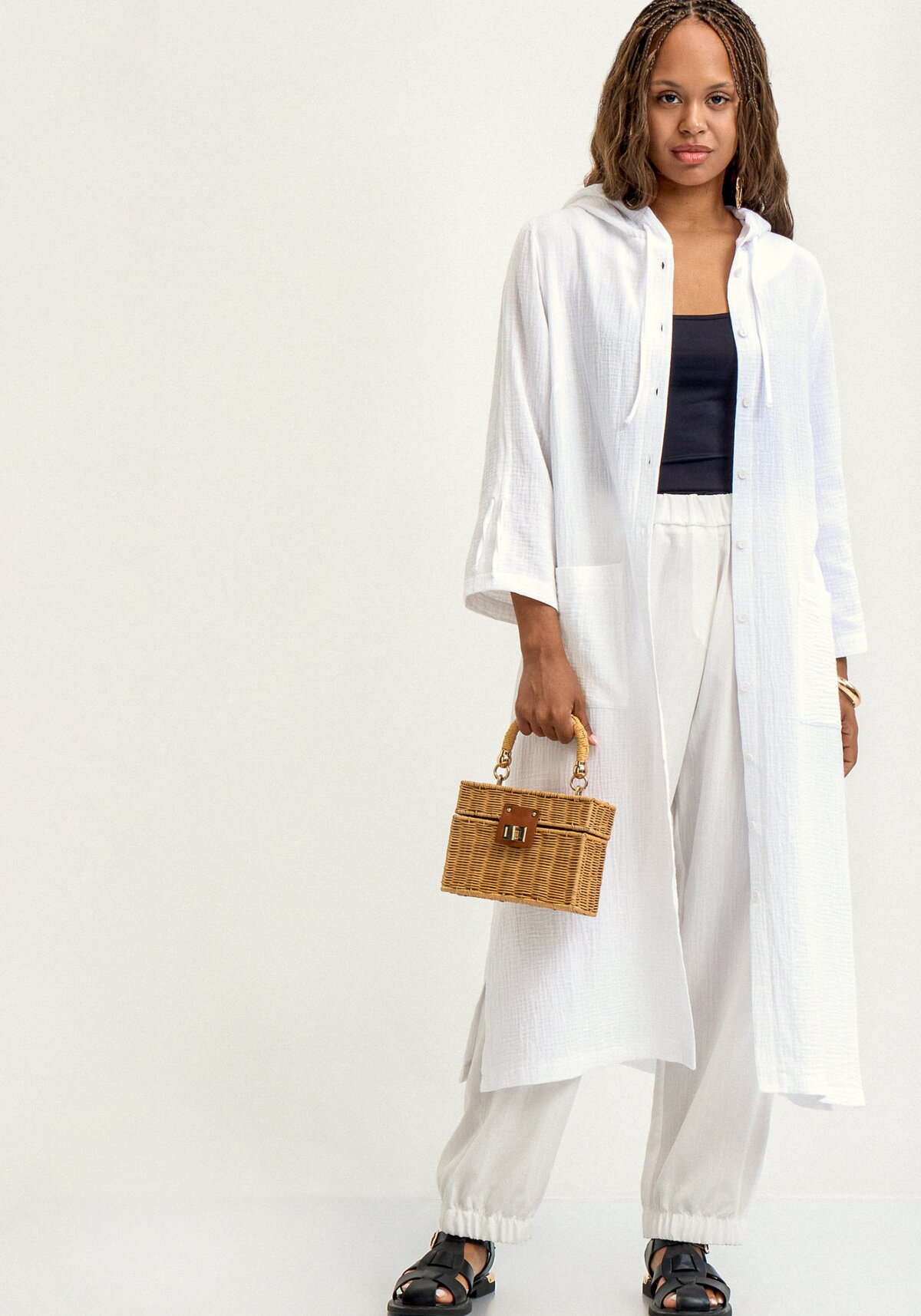 Удлиненный кардиган с капюшоном и накладными карманами. Выполнен из хлопка и вискозы. Застегивается на пуговицы. Модель представлена в трех цветах: бежевый, белый, оливковый.