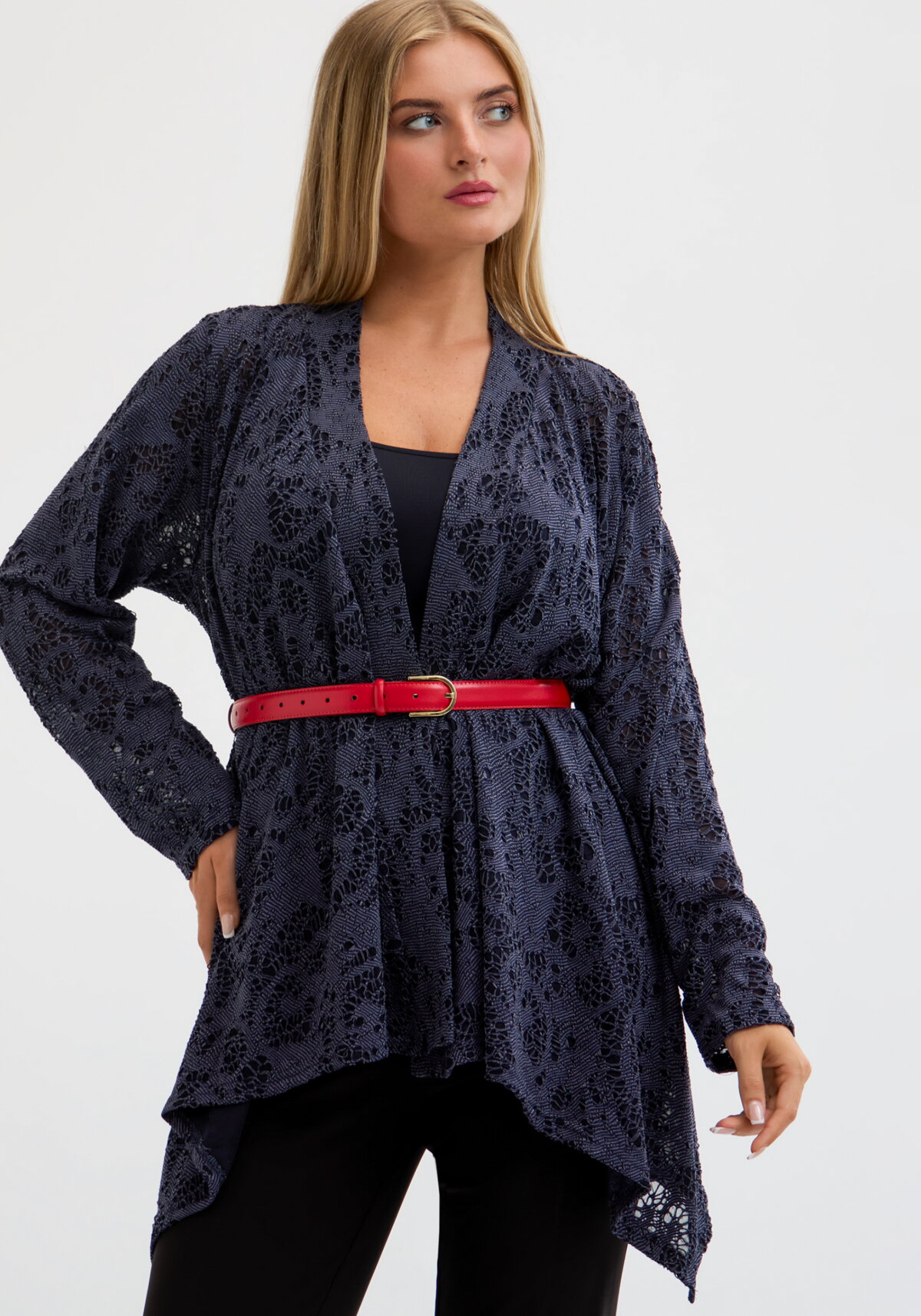 Кардиган с нежным кружевом. Ассиметричный крой. Модель представлена в двух цветах: черный и синий.
