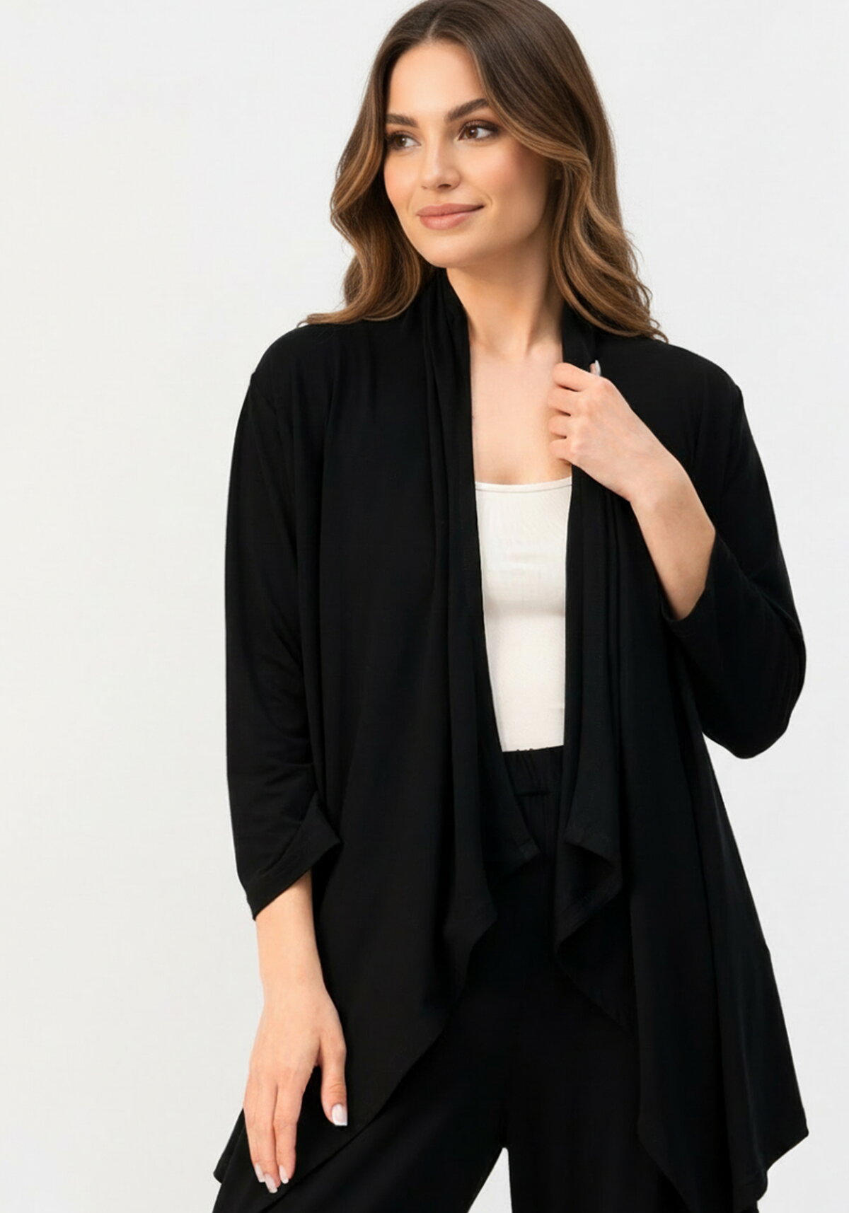 Кардиган из однотонной вискозы выполнен в свободном силуэте без конструктивных линий. Борта плавно переходят в воротник. Втачные одношовные рукава. Все края — низ изделия, рукавов, борта и воротник — обработаны на плоскошовной машине.