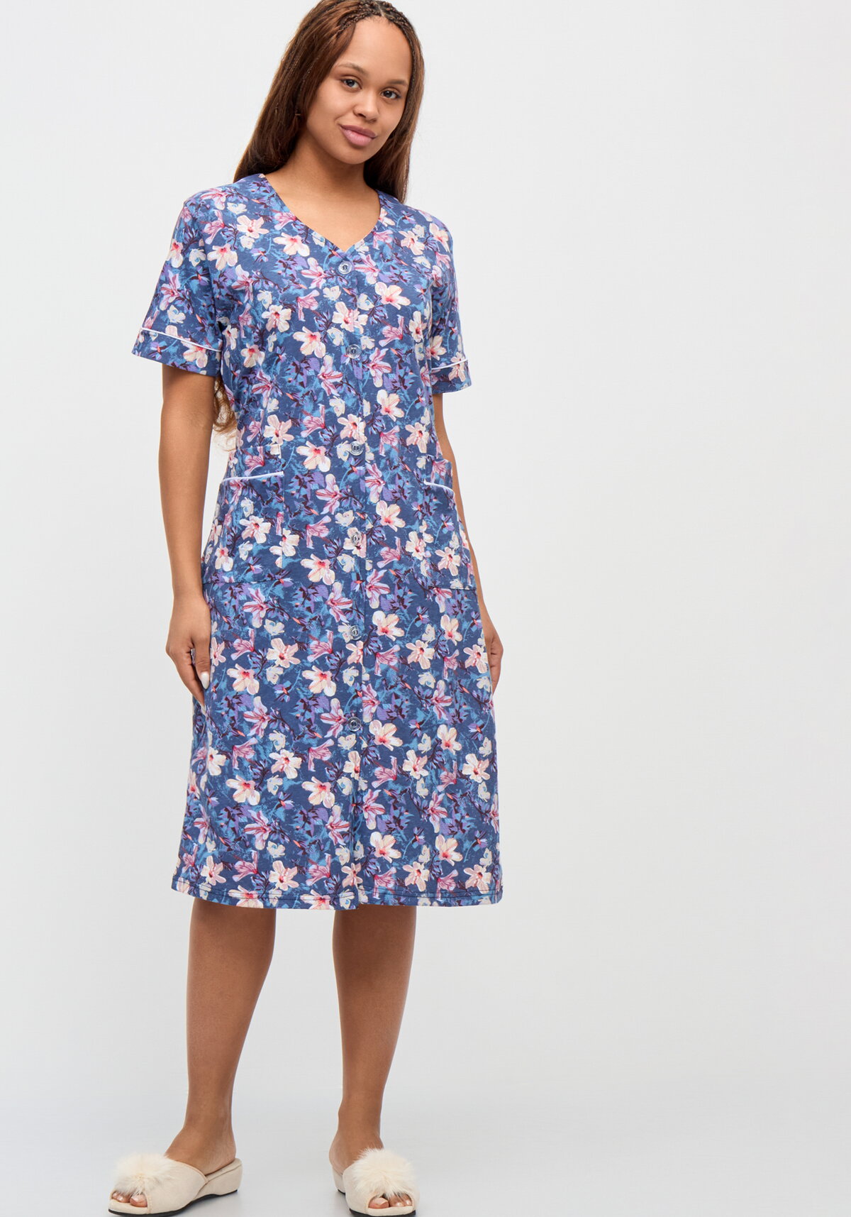 Уютный халат из хлопкового трикотажа с цветочным принтом выполнен в прямом крое длиной чуть ниже колена. Модель дополнена короткими втачными рукавами, накладными карманами и поясом, завязывающимся сзади. Застежка варьируется в зависимости от выбранного цвета: желтый и бирюзовый варианты оснащены удобной молнией, синий имеет пуговицы.