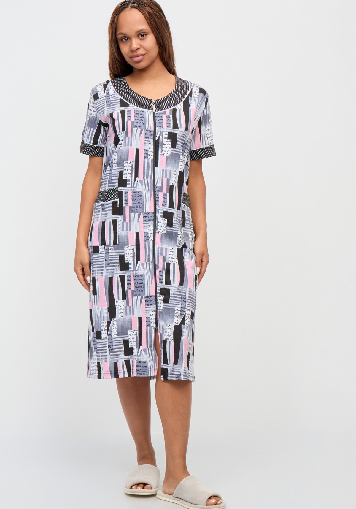 Стильный халат из хлопкового трикотажа с абстрактным принтом выполнен в удобном прямом крое длиной чуть ниже колена. Модель привлекает внимание изысканной отделкой — контрастная ткань в мелкий горошек украшает горловину и карманы. Короткие втачные рукава и накладные карманы обеспечивают практичность, а втачной пояс, завязывающийся сзади, позволяет подчеркнуть силуэт. Застежка на молнию делает использование халата еще более удобным.