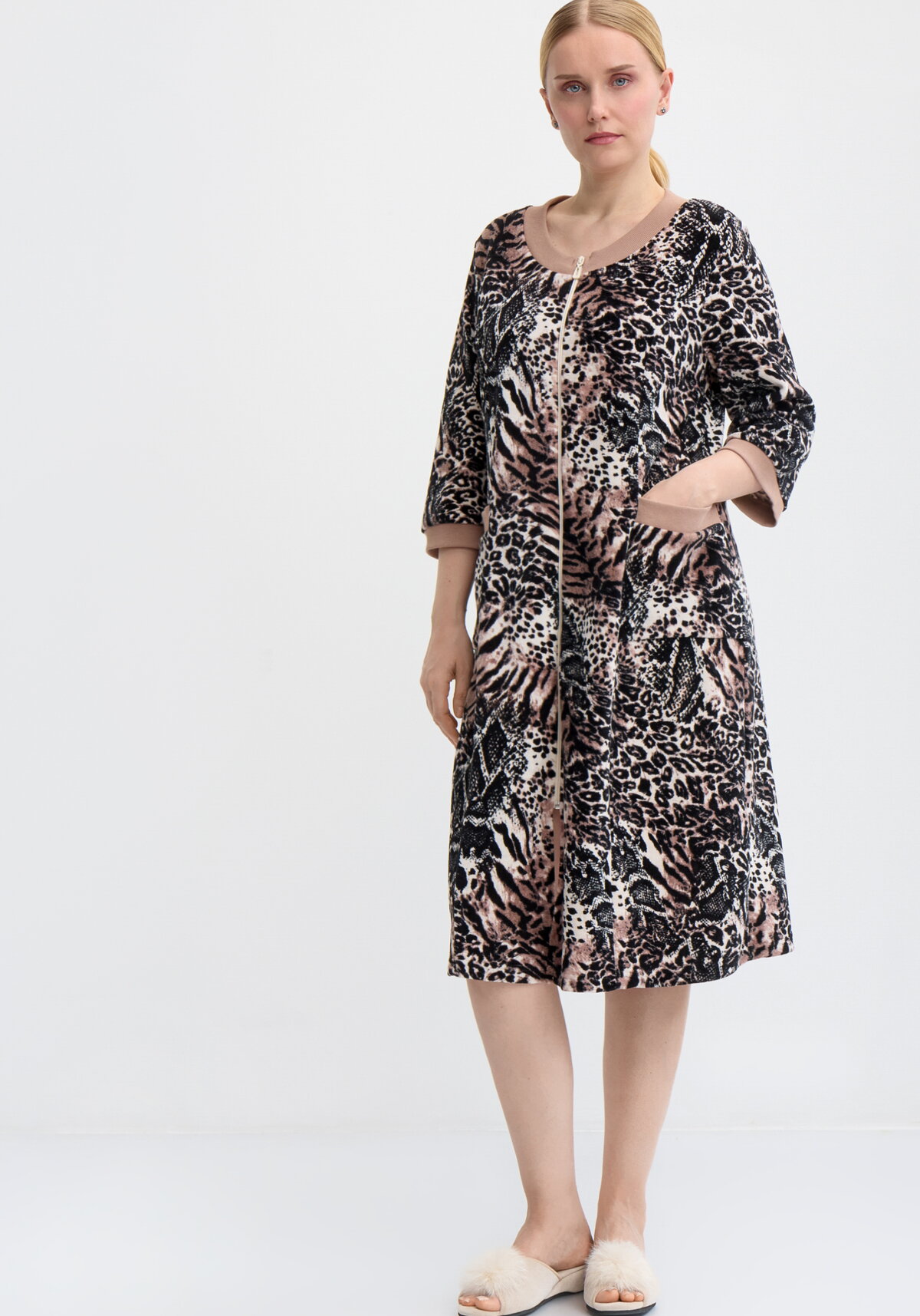 Домашний халат из мягкого велюра подарит непревзойденный комфорт: материал приятно прилегает к телу, а длина ниже колена обеспечивает уют и свободу движений. Модель продумана до мелочей: рукав 3/4 с притачной манжетой из кашкорсе (трикотажа с фактурой "английская резинка"), округлая горловина и накладной карман также оформлены обтачкой из этого эластичного материала. Удобный застегивающийся на молнию крой дополнен отрезным бочком и средним швом на спинке, что придаёт изделию аккуратную посадку по фигуре. Практичность и эстетика деталей делают халат идеальным выбором для домашнего отдыха.