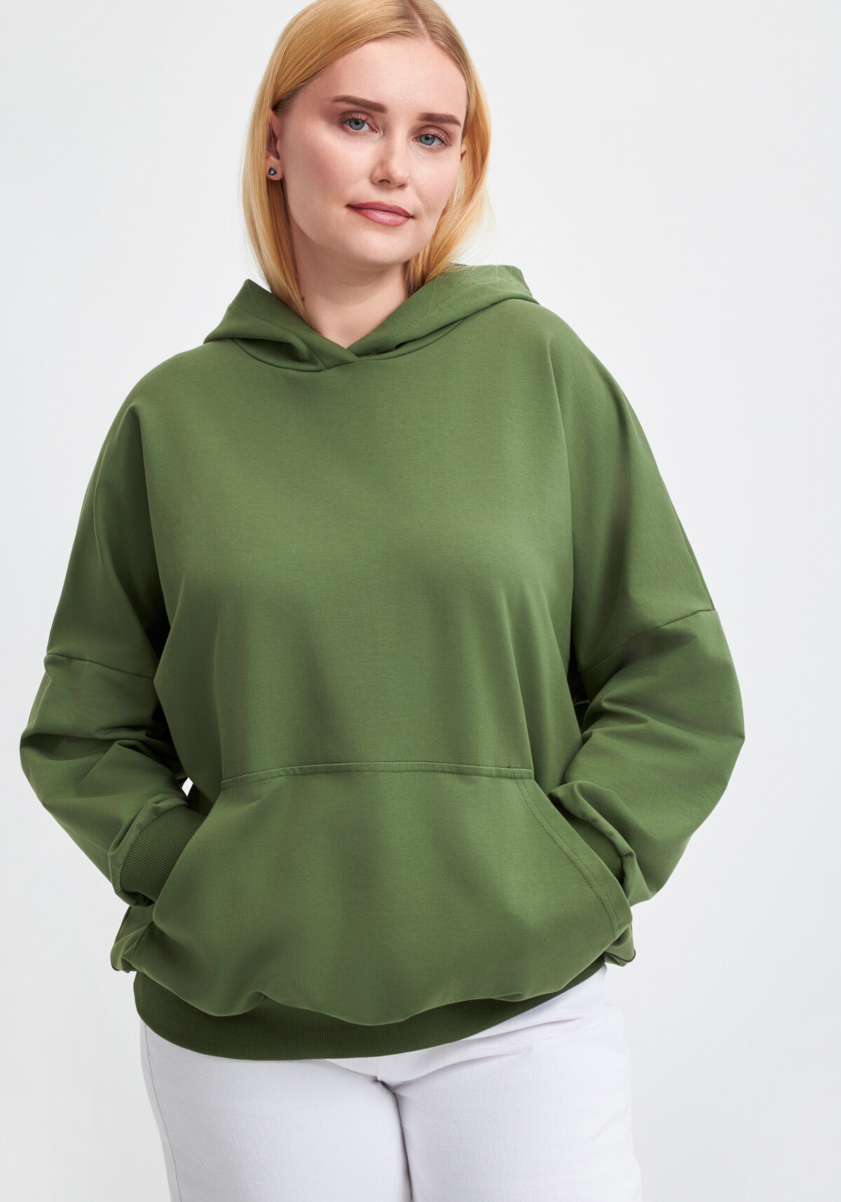 Худи свободного покроя из комбинированных полотен: футер и рибана, длиной ниже середины бедер. Спинка без конструктивных линий. На полочке располагается карман-кенгуру. Плечи спущенные, рукава длинные, одношовные с манжетами. Низ изделия с поясом из рибаны. Модель представлена в трех цветах: черный, желтый, коричневый.