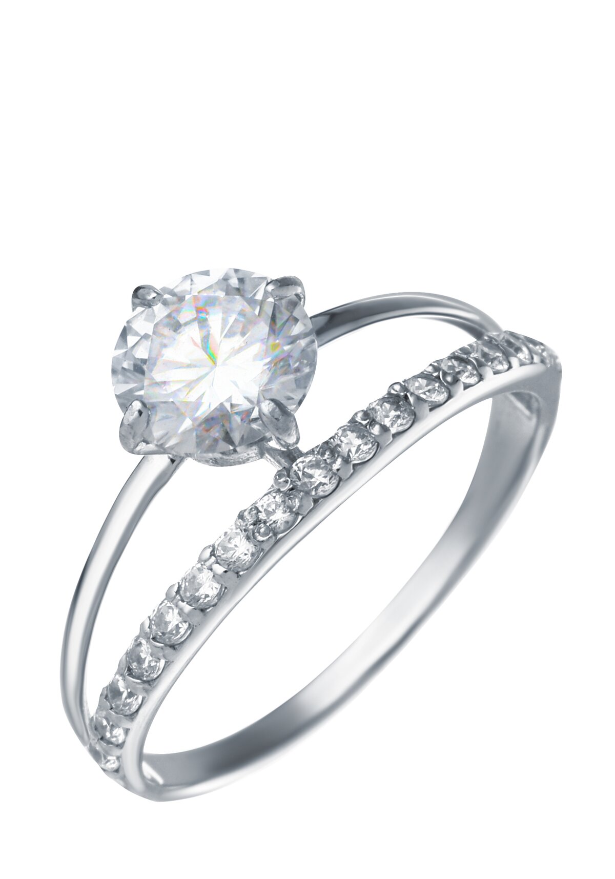 Кольцо с муассанитом и фианитами прекрасно сочетается с любым образом. Серебро 925 пробы покрыто родием.