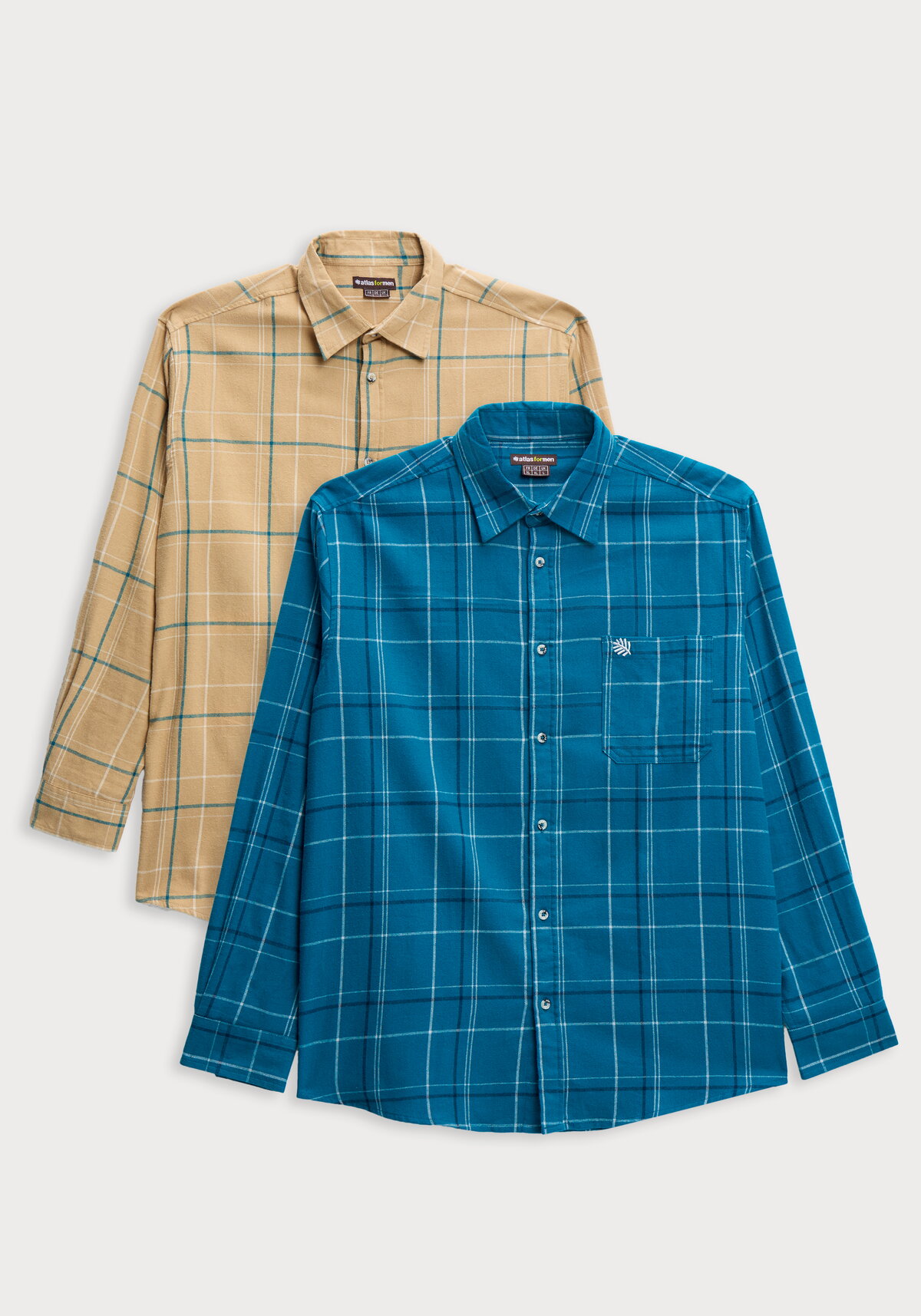 Комплект из двух хлопковых рубашек. Они непринужденно смотрятся, имеют нагрудный карман с небольшой вышивкой и оснащены пуговицами под рог. Удобный крой изделий обеспечивает абсолютный комфорт. Изделия имеют отложной воротник, манжеты с обтачными разрезами на пуговице, вставку на спине с двумя складками для удобства и закругленные полы.