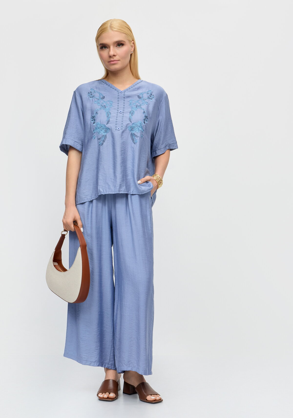 Элегантный комплект с изысканной вышивкой — идеальное сочетание утончённости и комфорта. Блуза с V‑образным вырезом и декоративными пуговицами изящно подчёркивает линию плеч. Короткий рукав делает образ лёгким и уместным для тёплого сезона. Широкие брюки с эластичным поясом обеспечивают свободу движений и безупречную посадку, создавая расслабленный, но стильный силуэт — вместе эти вещи складываются в гармоничный ансамбль.
