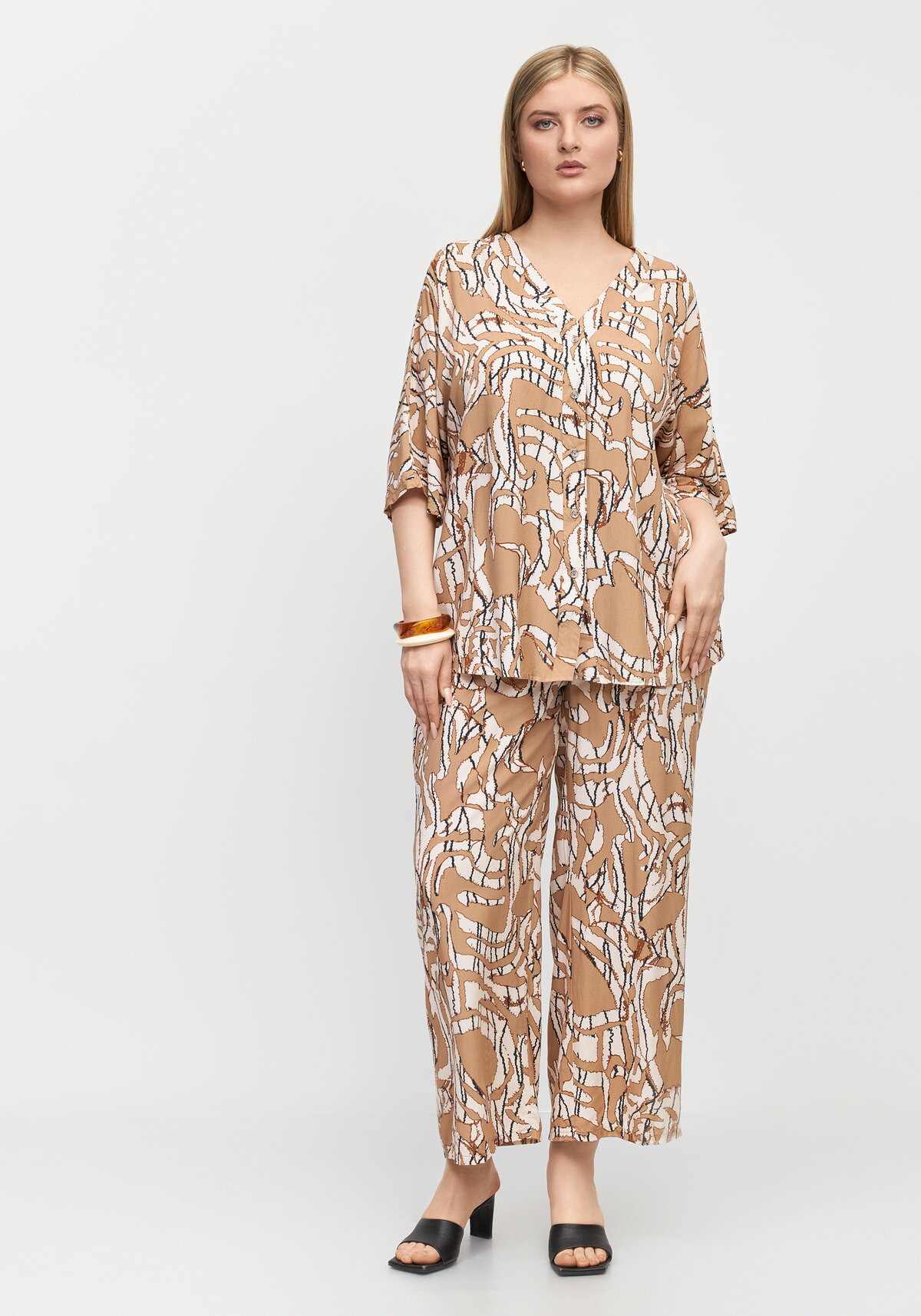 Элегантный костюм из блузы и брюк подчеркнёт ваш безупречный стиль — гармоничное сочетание 80% вискозы и 20% лавсана дарит ткани благородную мягкость, лёгкую драпировку и комфорт на весь день. Изысканная блуза с V‑образным вырезом и рукавом 3/4, застёгивающаяся на пуговицы, добавит образу утончённости, а продуманный крой выгодно подчеркнёт линию плеч и рук. Удобные брюки с эластичным поясом и боковыми карманами обеспечат свободу движений и практичность: вы будете чувствовать себя уверенно как в деловой обстановке, так и на светском мероприятии. Этот костюм станет настоящей находкой для тех, кто ценит сочетание элегантности, комфорта и функциональности в каждой детали!