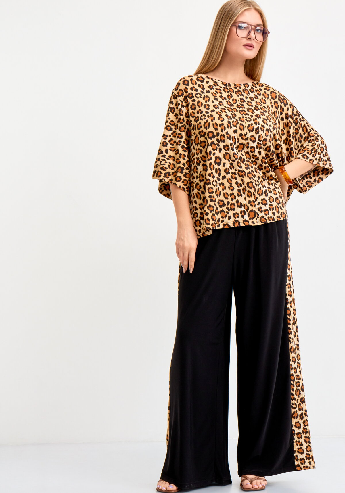 Комплект из блузы и брюк. Блузка расширенного силуэта длиной до линии бедер. Горловина обработана обтачкой. Отделочная строчка. Низ рукава обработан притачной манжетой. Широкие брюки с лампасами и карманами в шве. Притачной пояс на резинке. Модель представлена в двух цветах: черный и коричневый.